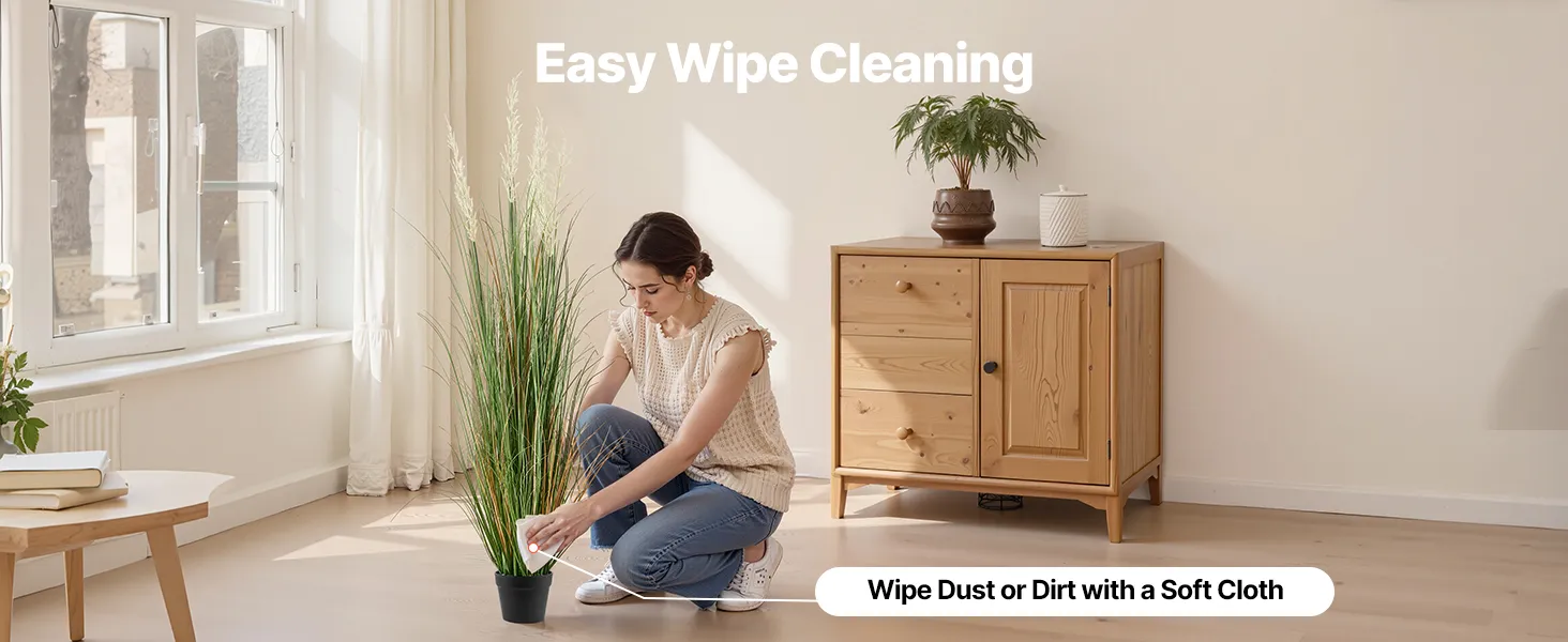 Veeg stof en dagelijkse vlekken eenvoudig weg met een zachte doek. Het decoratieve kunstgras ziet er altijd als nieuw uit met minimale inspanning en is snel en eenvoudig te onderhouden.