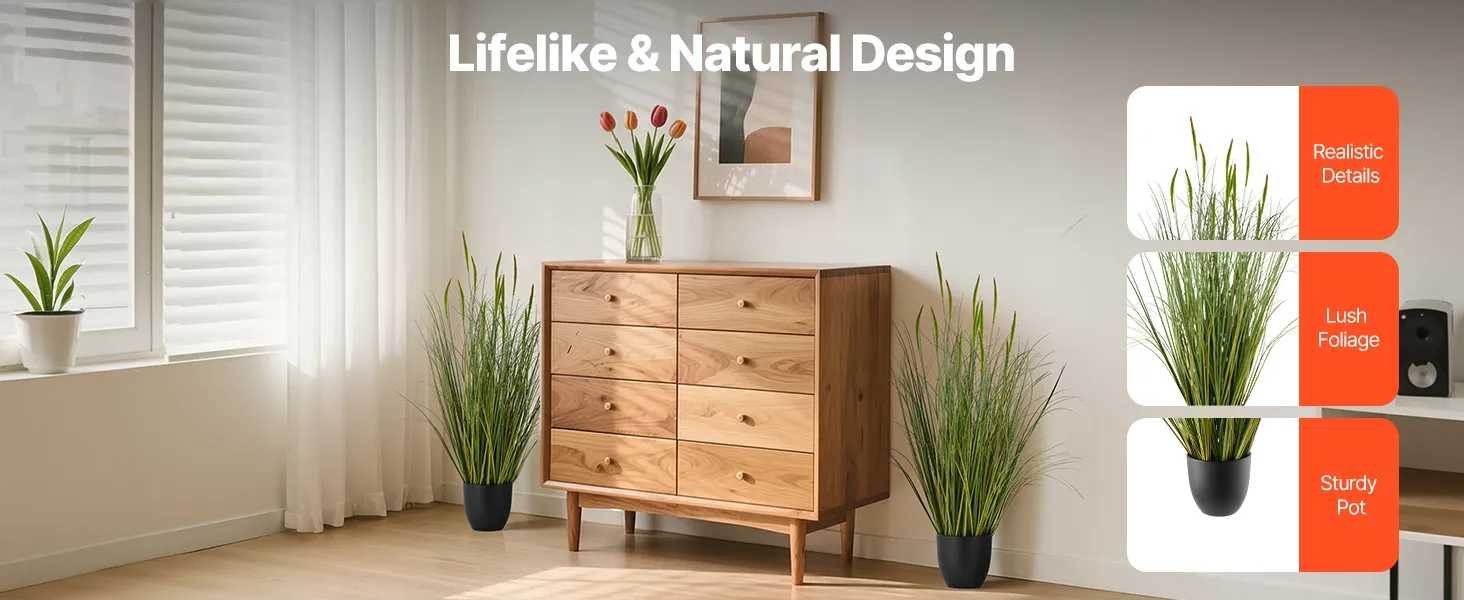 Deze realistische grasplant is geschikt voor zowel binnen als buiten. Of het nu op de veranda, in de woonkamer, in de tuin of in de hotellobby is – hij verrijkt elke ruimte direct en zorgt voor een groene sfeer.