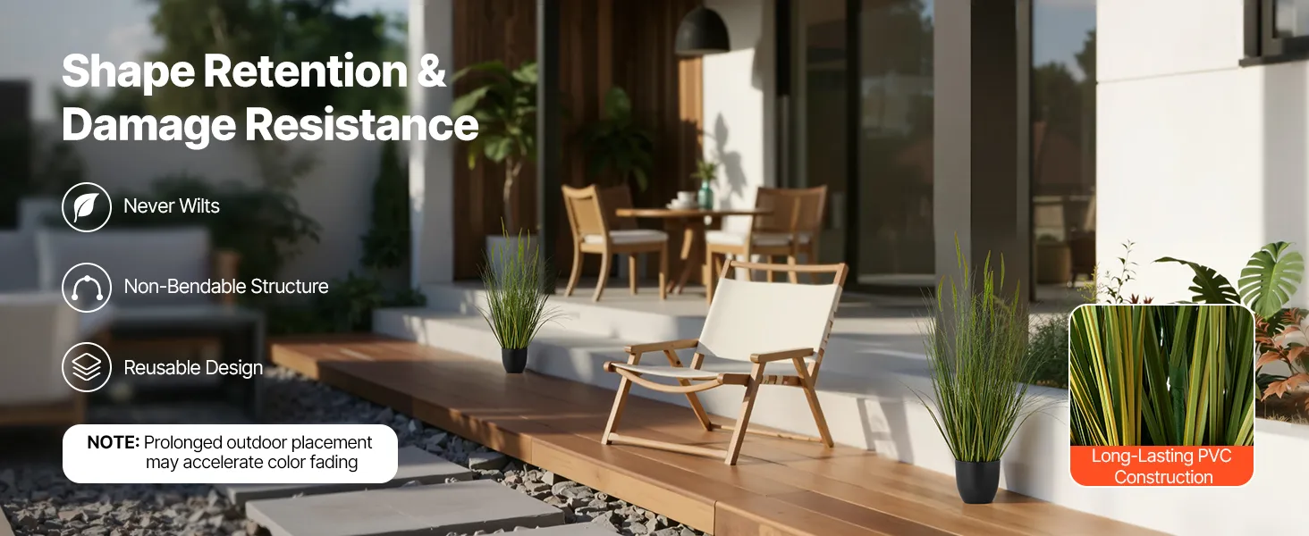 Onze kunstgrasplant in pot is gemaakt van duurzaam PVC-materiaal en zal niet snel verwelken of buigen. De plant is herbruikbaar en de rechtopstaande bladeren behouden hun natuurlijke uitstraling en blijvende schoonheid.