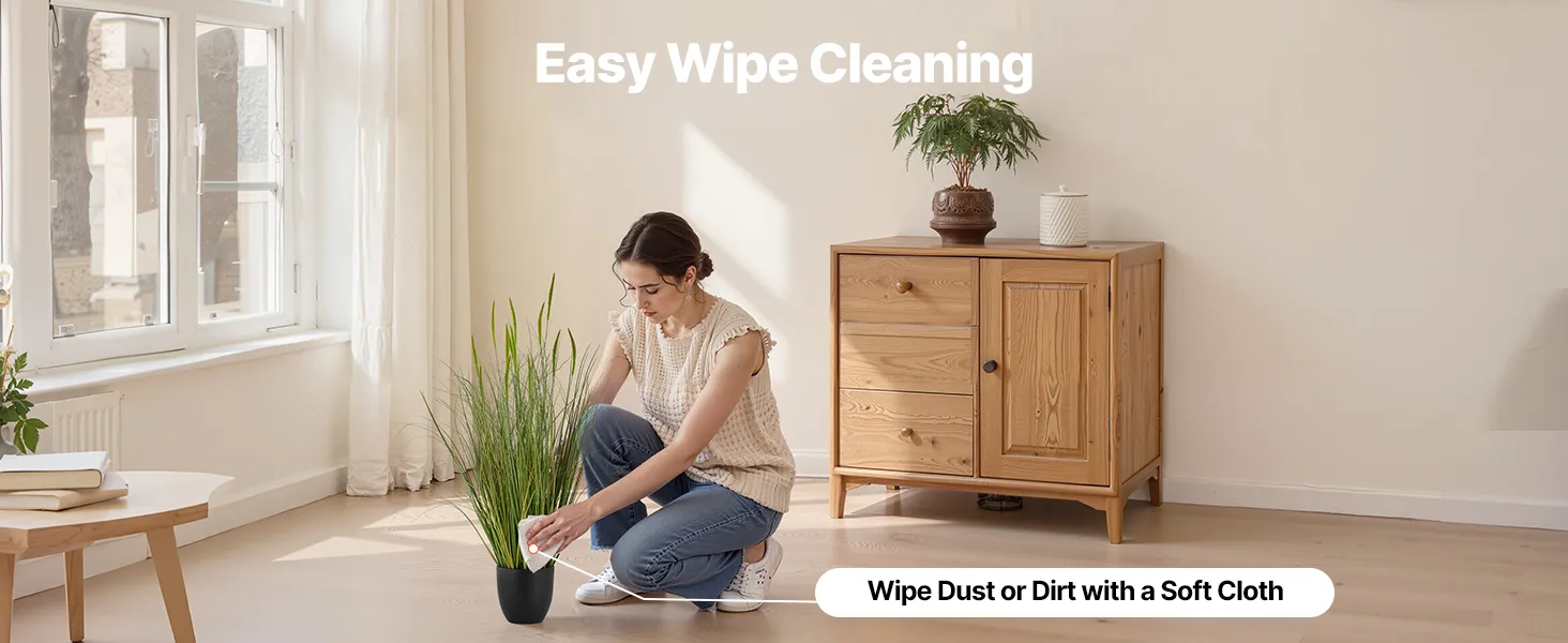 Veeg stof en dagelijkse vlekken eenvoudig weg met een zachte doek. Het decoratieve kunstgras ziet er altijd als nieuw uit met minimale inspanning en is snel en eenvoudig te onderhouden.