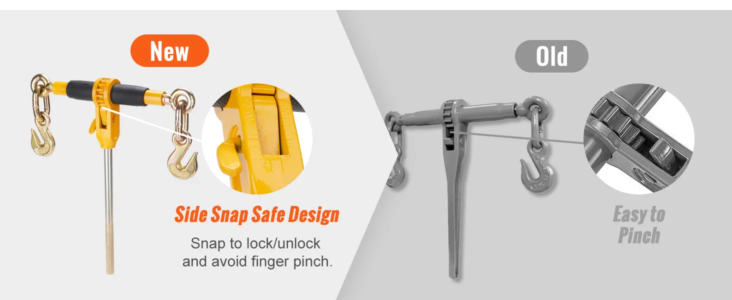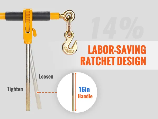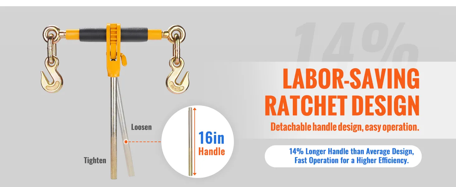 The ratchet device helps you easily tighten/loosen the chain. The 40 cm handle is 5 cm longer than the ordinary one, and the labor-saving effect is increased by 14% for effortless operation.
