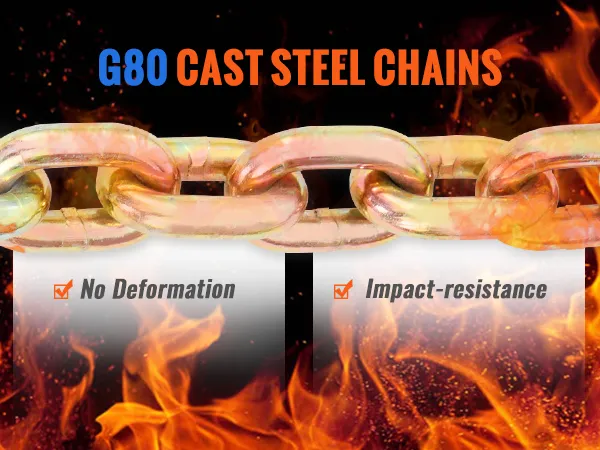 The G80 cast steel chains forged by high temperature are not easily deformed and broken even under harsh outdoor environment for a long time and is wear-resistant and corrosion-resistant.