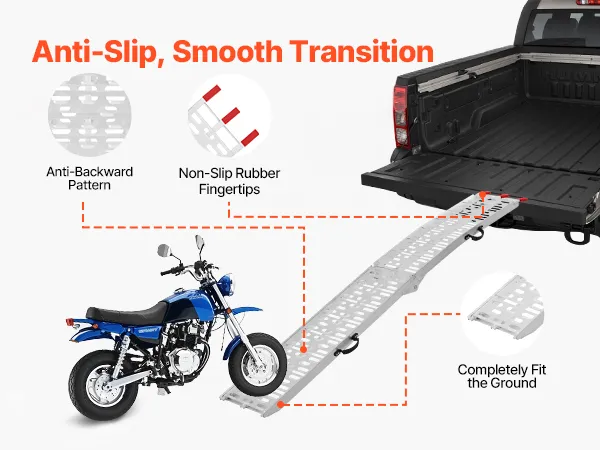 Non-Slip Stability: Designed with rubber three-finger claw plates, the ramp securely grips the pickup truck edge, avoiding shifting during use. The non-slip surface pattern ensures secure uphill transportation. Note: Avoid exceeding the recommended load capacity to prolong the ramp's service life.