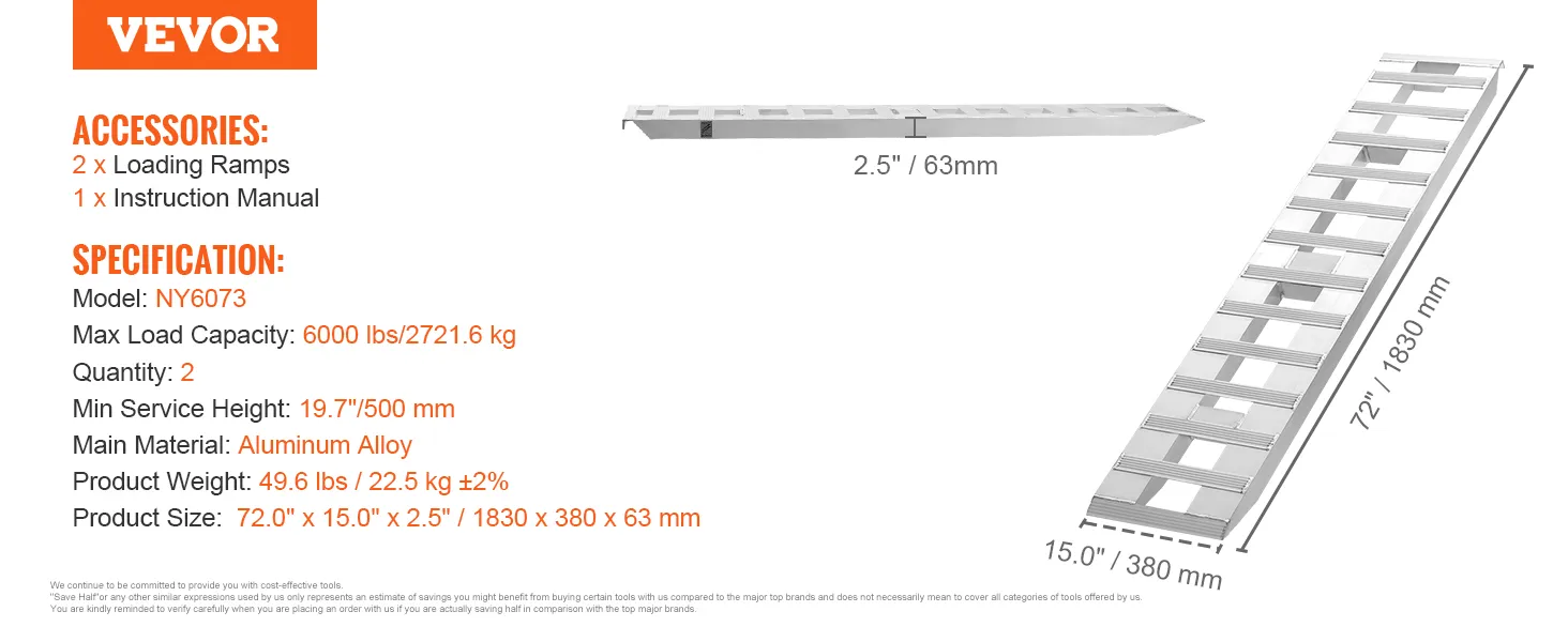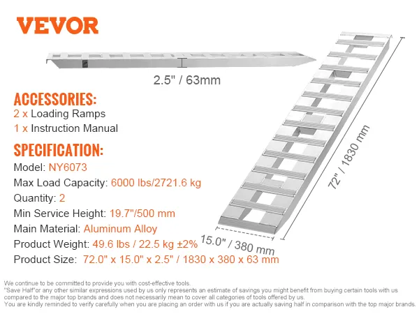 Maximaal laadvermogen van 5.000 lbs: Deze verlengde laadbrug voor vrachtwagens is op veiligheid getest en kan maximaal 6.000 lbs (5.000 lbs) dragen. Het vervoeren van landbouwtractoren, ATV's, grasmaaiers, sneeuwblazers, motorfietsen, aanhangwagens en auto's was nog nooit zo eenvoudig! Elke oprit meet 72 x 15 inch (1830 x 380 mm) en is geschikt voor voertuigen of apparaten op wielen met banden tot 14 inch (35,56 cm) breed en is ideaal voor gebruikers die een lange en zachte oprit nodig hebben.