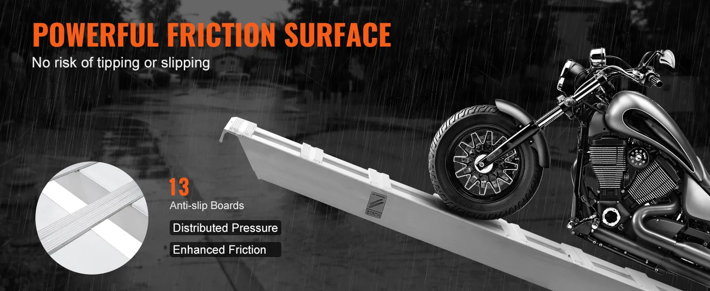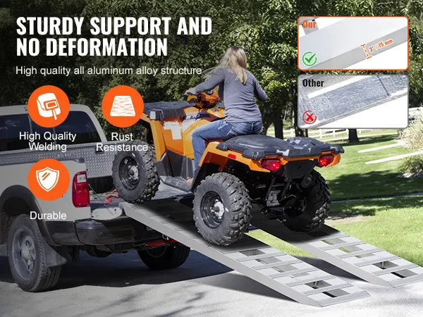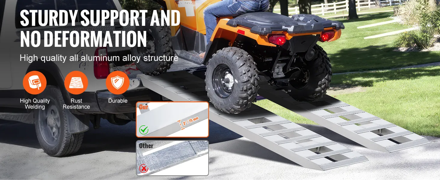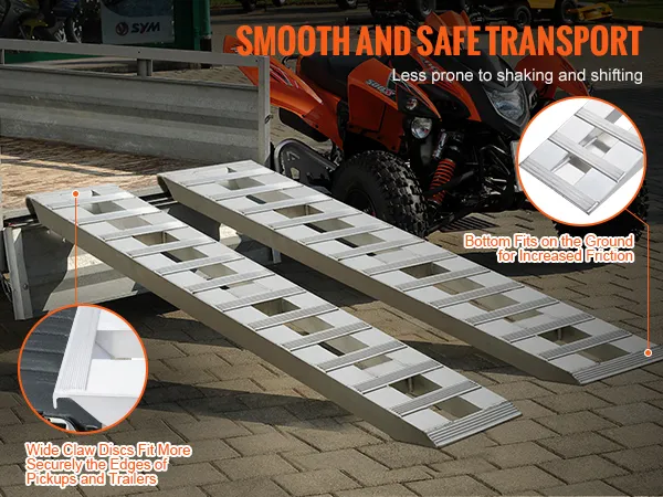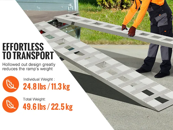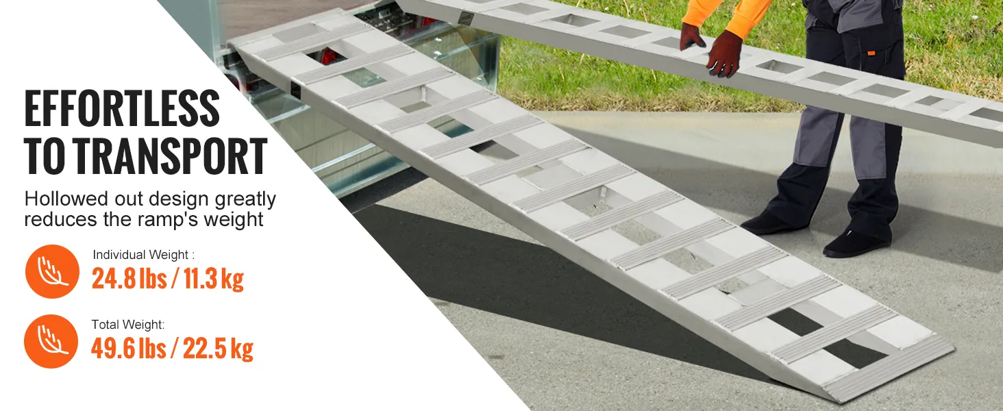 Lichtgewicht en draagbaar: met een totaalgewicht van 22,5 kg (49,6 lbs) en een gewicht van 11,3 kg (24,8 lbs) per oprijplaat is onze oprijplaat licht van gewicht en gemakkelijk te verplaatsen. Wanneer u de oprijplaten niet gebruikt, kunt u ze compact opbergen in uw garage of vrachtwagen.