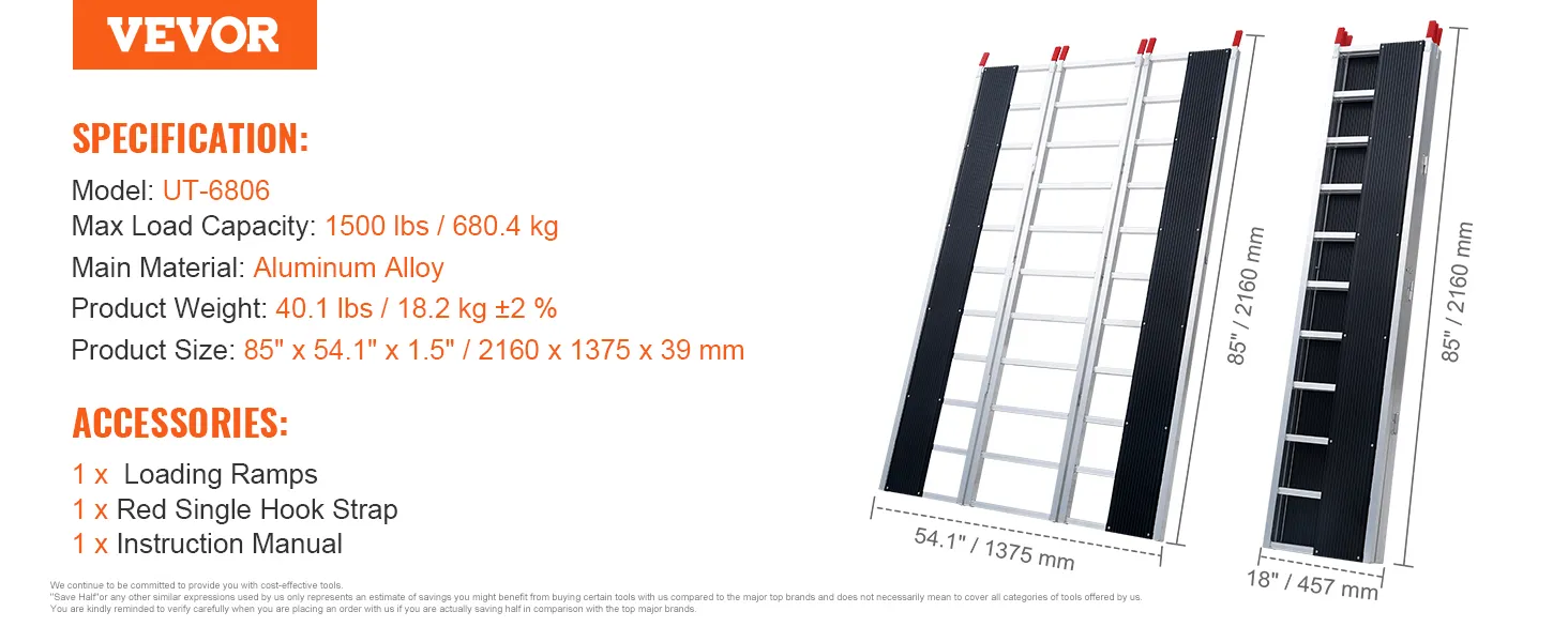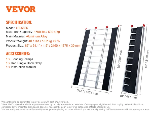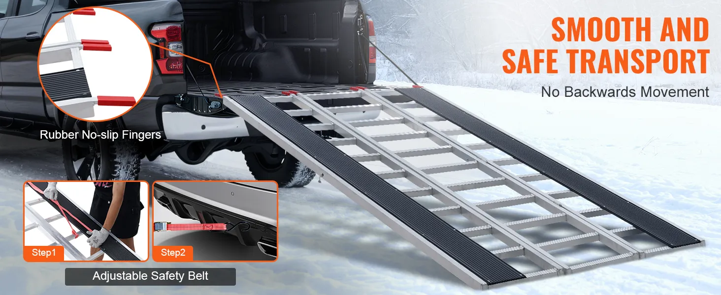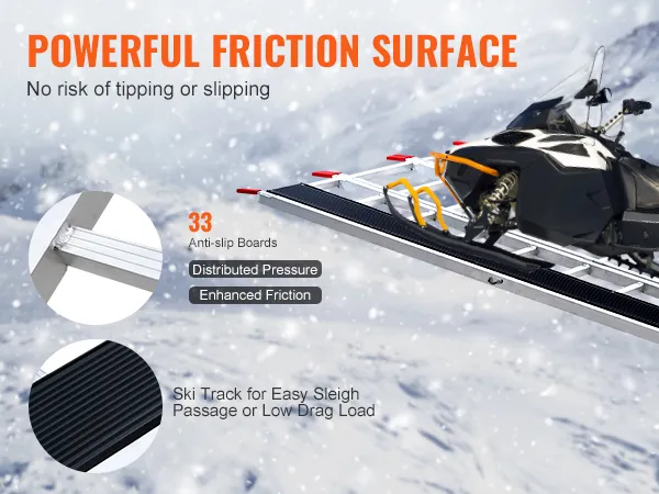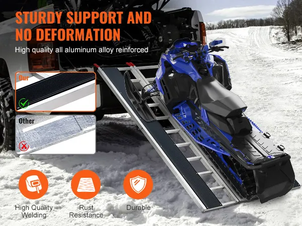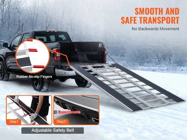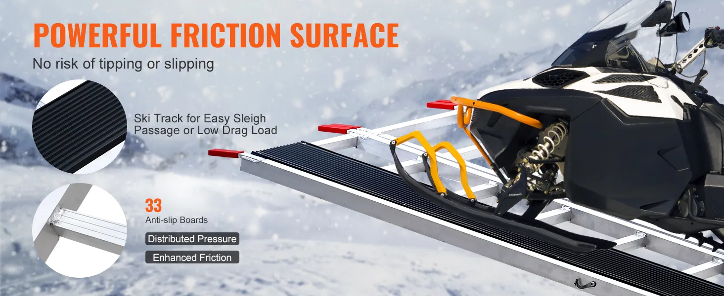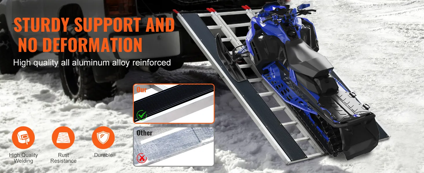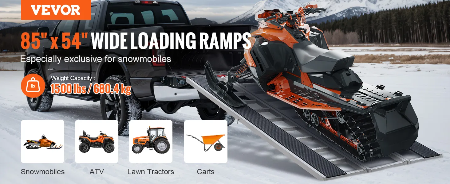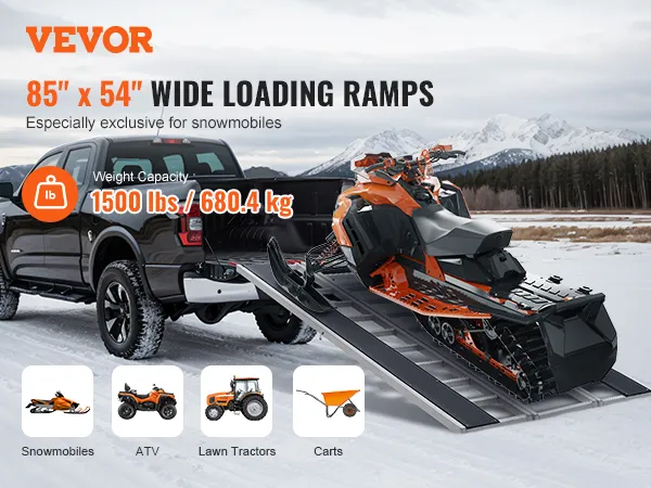 Extra-Wide Snowmobile Ramp: Measuring 85 x 54 in with two 81.6 x 7.9 in ski tracks, this snowmobile ramp supports up to 1500 lbs, ideal for ATVs, mowers, and more. Ideal for truck loading on farms, in garages, or during outdoor travel