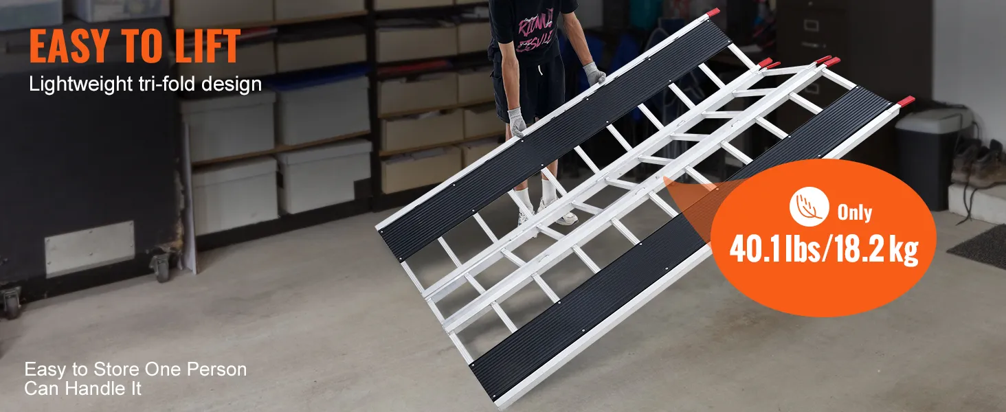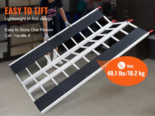 This tri-fold folding ramp is lightweight and compact. The aluminum frame and cut-out design make it easy for one person to lift, move, and store without taking up space.