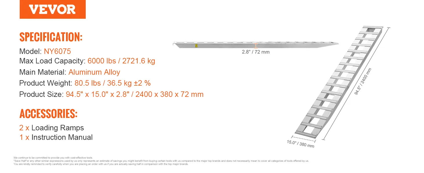 6,000 Lbs Weight Capacity: This extended truck loading ramp set supports up to 10,000 lbs combined. Each ramp measures 94 x 15 in, fits tires up to 14 in wide, and provides a longer, gentler incline, ideal for tractors, ATVs, lawn mowers, motorcycles, and more