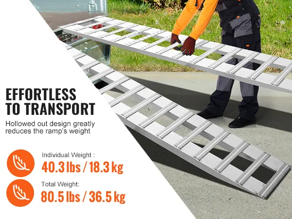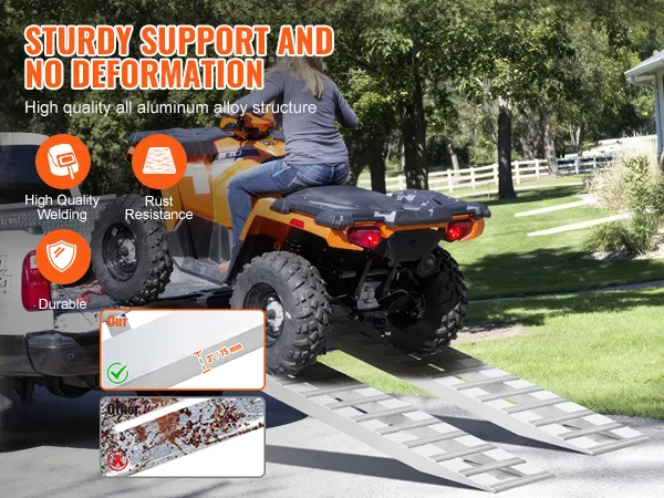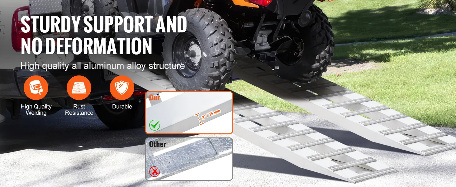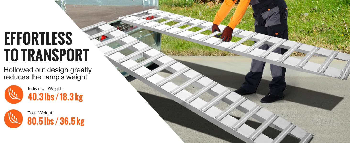 Heavy-Duty Loading Ramp: This loading ramp is crafted from quality aluminum with reinforced welds. Its thick cross rungs and 3 cross support tubes ensure even weight distribution, while solid beams handle heavy loads without bending or breaking
