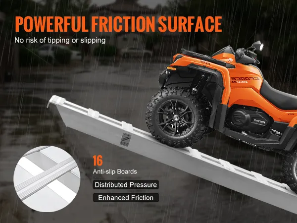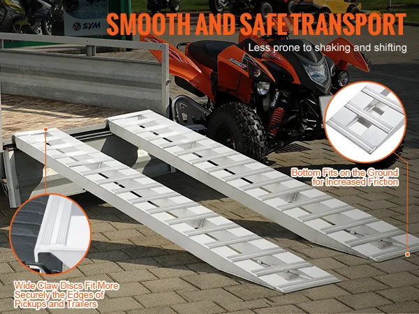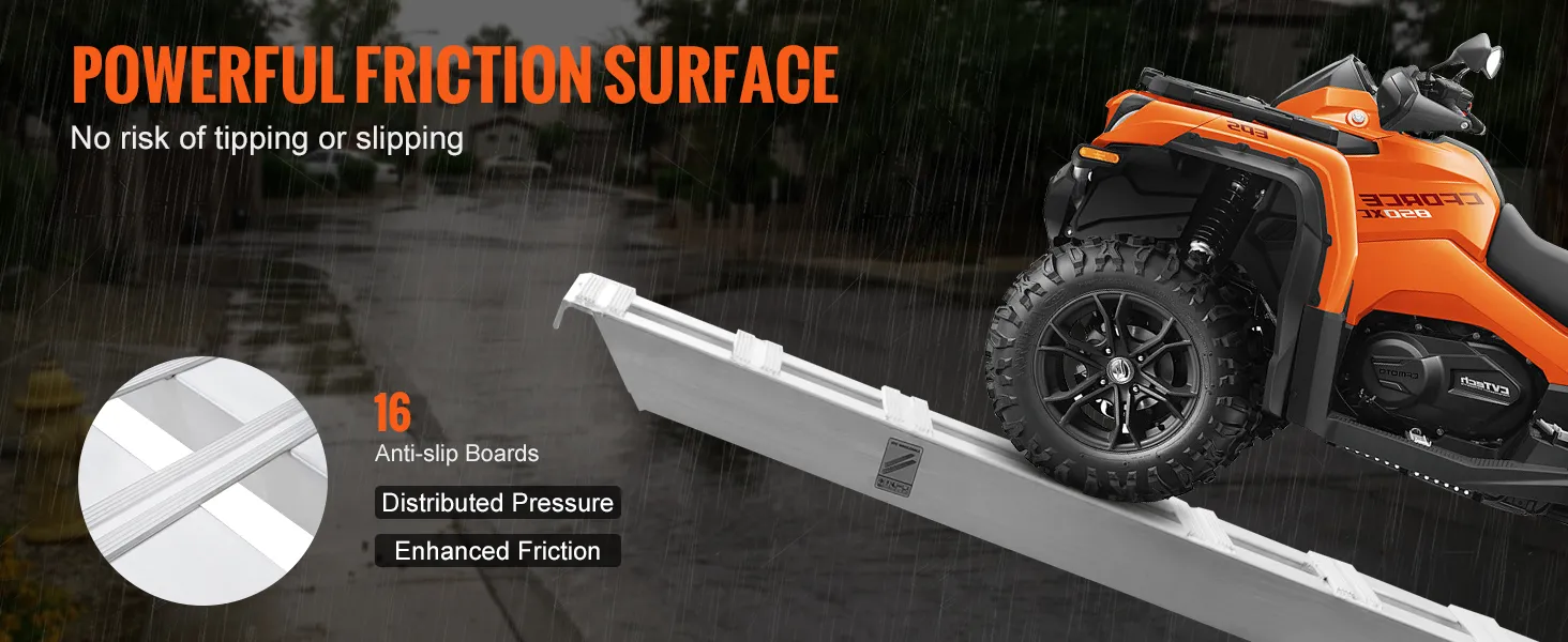 Each cross tube has dense, grooved patterns to increase tire grip and reduce sliding. This aluminum loading ramp provides stable traction in both dry and wet conditions.