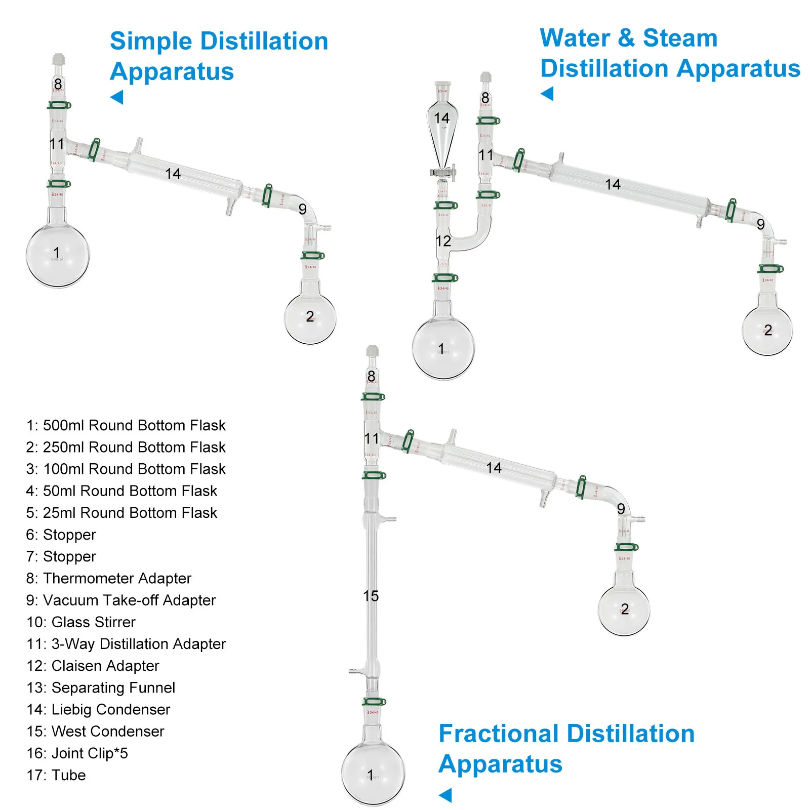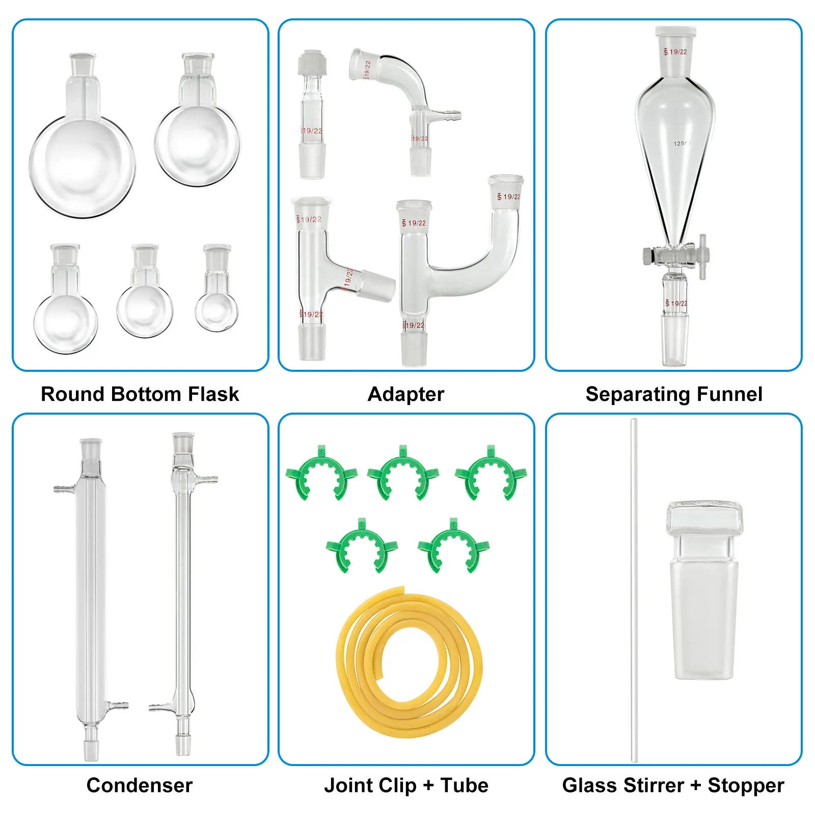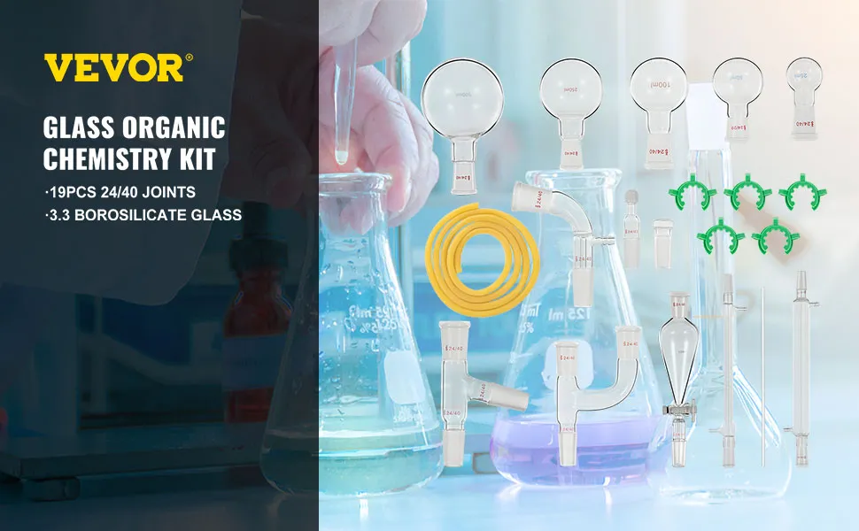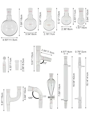 Als professionele chemieglaswerkset bevat deze bijna alles wat u nodig heeft, zoals scheitrechter, condensor, kolf, adapter, enz.