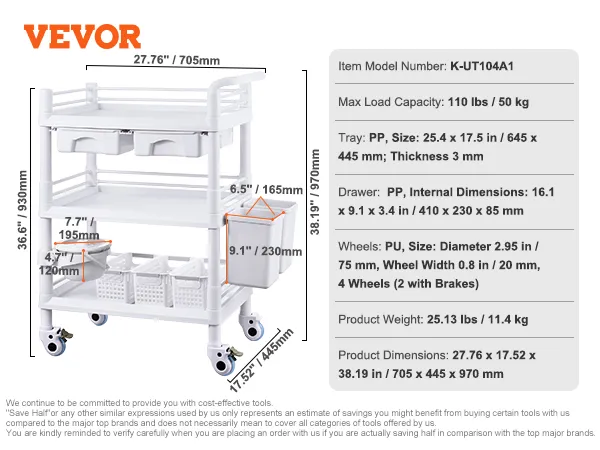 Duurzaam materiaal: uitstekende schokbestendigheid en chemische corrosiebestendigheid zorgen ervoor dat de medische wagen er lang als nieuw blijft uitzien, waardoor de onderhoudskosten worden verlaagd. De VEVOR-wagen is gemaakt van ABS-materiaal met hoge dichtheid en versterkt met interne stalen platen. Het is bestand tegen slijtage bij dagelijks gebruik en garandeert langdurige betrouwbaarheid.