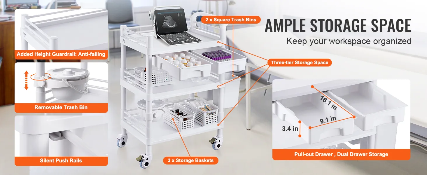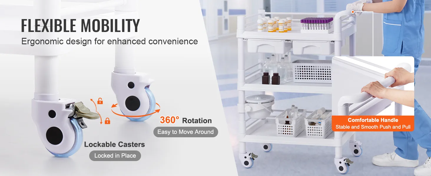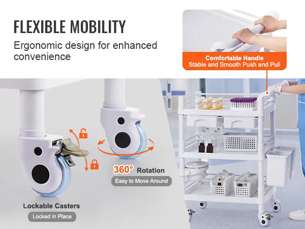 Deze 3-laags labwagen kan tot 110 pond dragen. Hij is dus erg sterk. Hij heeft een brede bovenste lade voor het veilig plaatsen van medische apparatuur. Antislipranden houden items veilig en stabiel. Dit ontwerp zorgt ervoor dat uw apparaten veilig zijn terwijl u de wagen verplaatst. U kunt vertrouwen op de robuuste constructie voor betrouwbaar gebruik in elke omgeving. Met zijn sterke laadvermogen en antislipfuncties is deze wagen een betrouwbare keuze voor zowel medische als laboratoriumomgevingen.