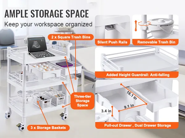 De kar heeft meerdere lagen voor efficiënte opslag. Er is voldoende ruimte op de bovenste lade en de onderste laden. Dit ontwerp maakt het organiseren van benodigdheden eenvoudig en handig. De laden worden geleverd met verborgen stille rails voor een soepele werking. Deze functie zorgt voor privacy en eenvoudige toegang tot opgeslagen artikelen. U kunt verschillende medische en laboratoriumbenodigdheden georganiseerd en binnen handbereik houden. Met zijn rijke opslagopties is het ideaal voor professionals in de gezondheidszorg en anderen.