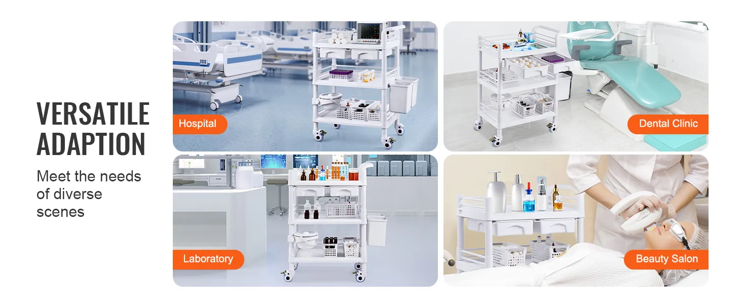 U kunt erop vertrouwen dat deze labwagen veelzijdig is en zich gemakkelijk aanpast aan verschillende omgevingen. Hij is perfect voor gebruik in drukke ziekenhuizen, professionele laboratoria en thuiszorgomgevingen! Hij heeft een breed toepassingsbereik, waardoor hij geschikt is voor professionals in de gezondheidszorg, verpleegkundigen en schoonheidsspecialisten. De wagen biedt handige opslag- en transportoplossingen voor verschillende benodigdheden. Deze tool biedt flexibiliteit om aan uw behoeften te voldoen in verschillende scenario's. Met zijn flexibele gebruik wordt het een essentieel item voor meerdere professionals.