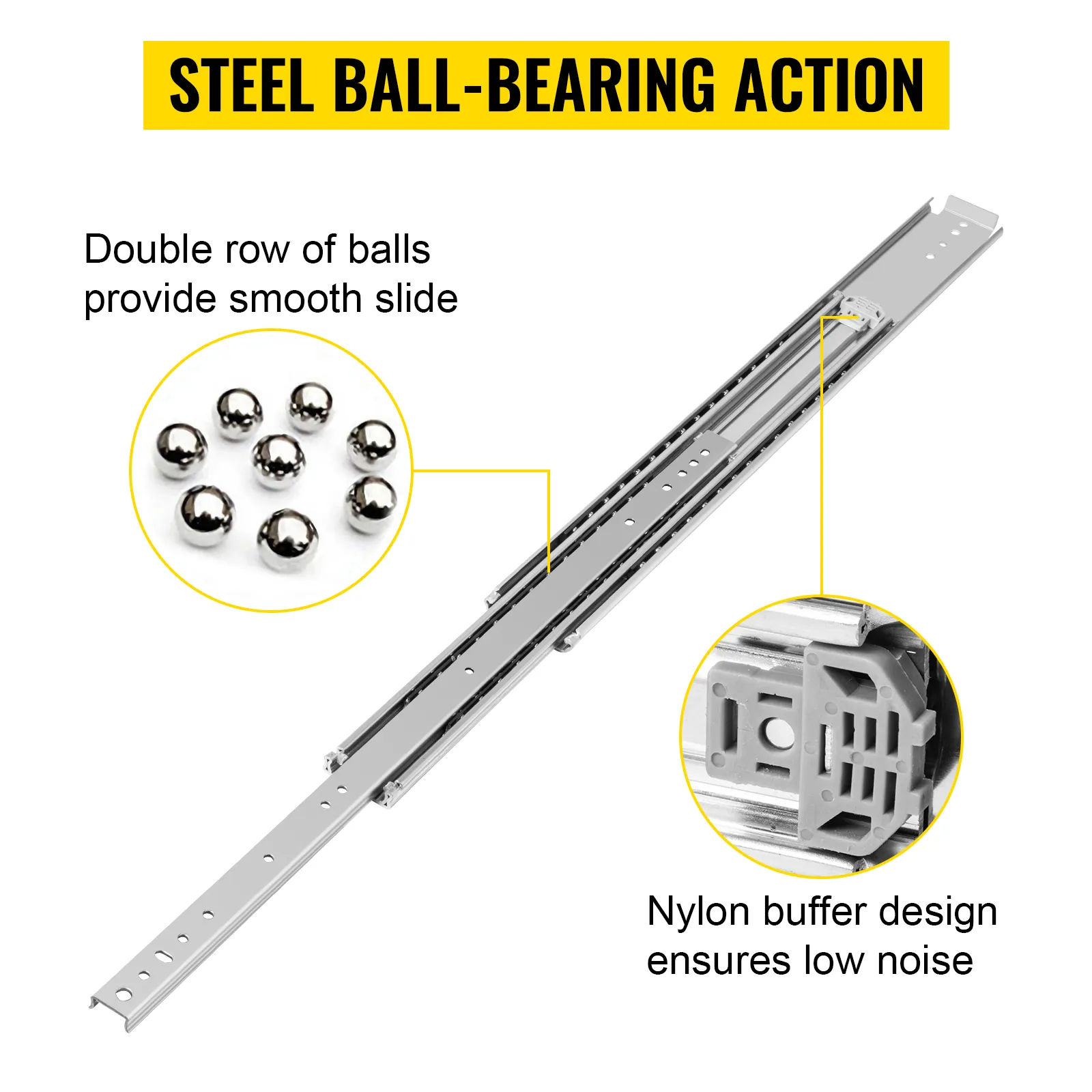 Nylon buffer can reduce the direct contact between the outer and the inner channel. In addition, the embedded steel balls make the smooth sliding and quiet.