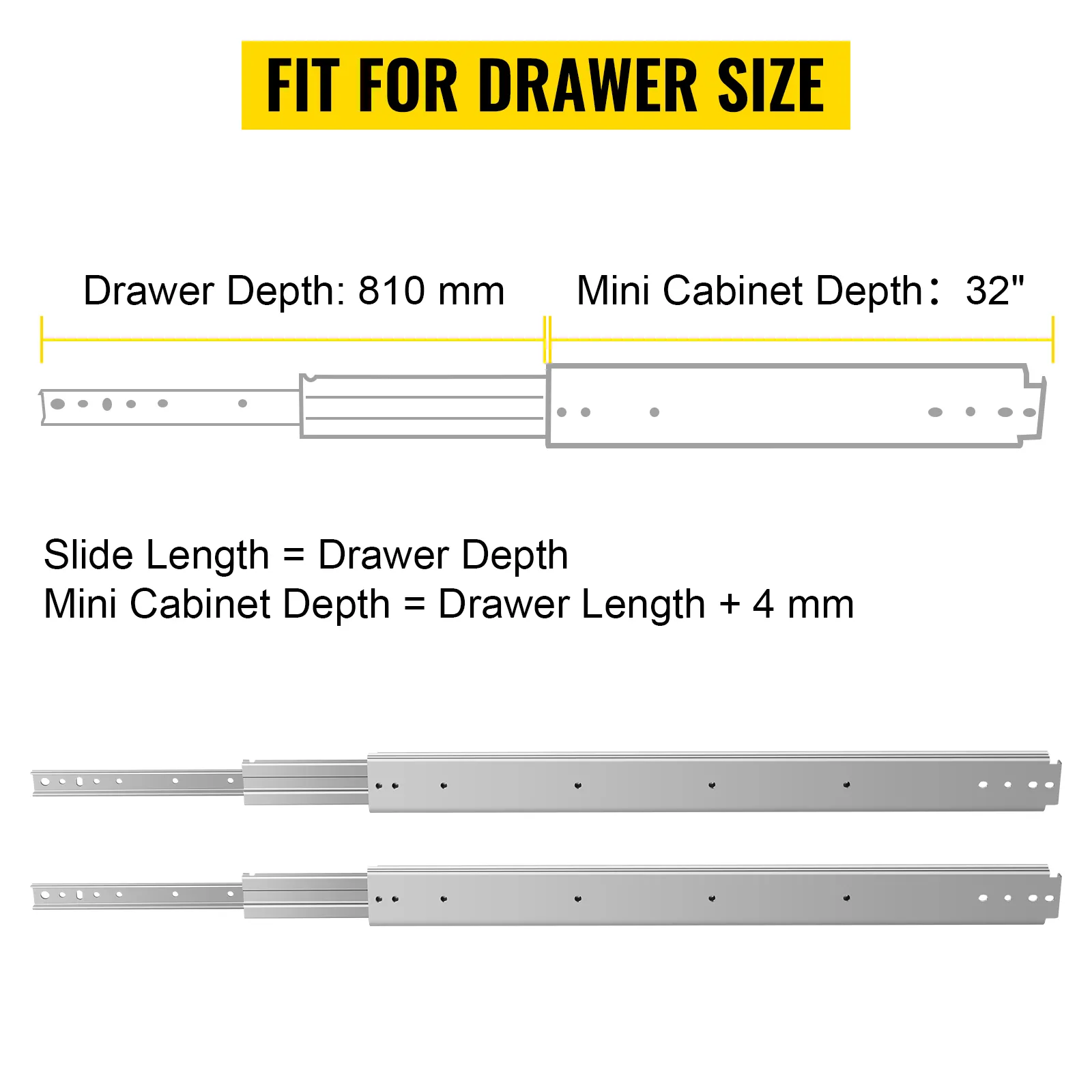 Slide length can be equal to drawer depth, and the minimized cabinet depth can be drawer length plus 4 mm. Please note that the side-mounted slide rails on both sides should be parallel.