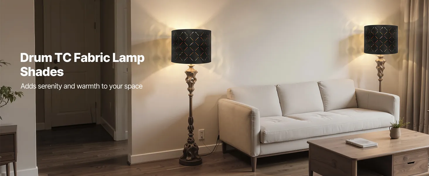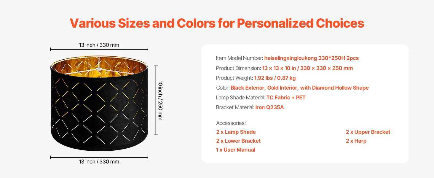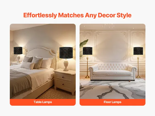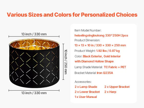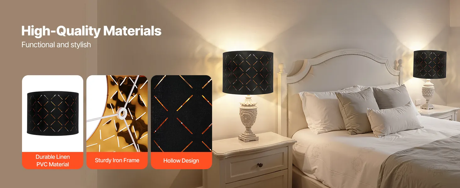 VEVOR Drum lampenkap 33x33x25 cm (boven x onder x hoog), 2 middelgrote vervangende kappen van TC-stof + PET, Harp lampenkap voor tafellampen en staande lampen (Black Diamond Hollow Design)