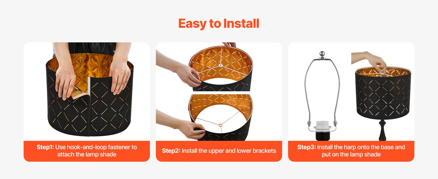 De lampenkap wordt geleverd met een bijpassende adapter en een complete gereedschapsset, waardoor hij ook voor senioren eenvoudig te installeren is. Hij is compatibel met E27-fittingen en kan in slechts drie eenvoudige stappen worden geïnstalleerd.