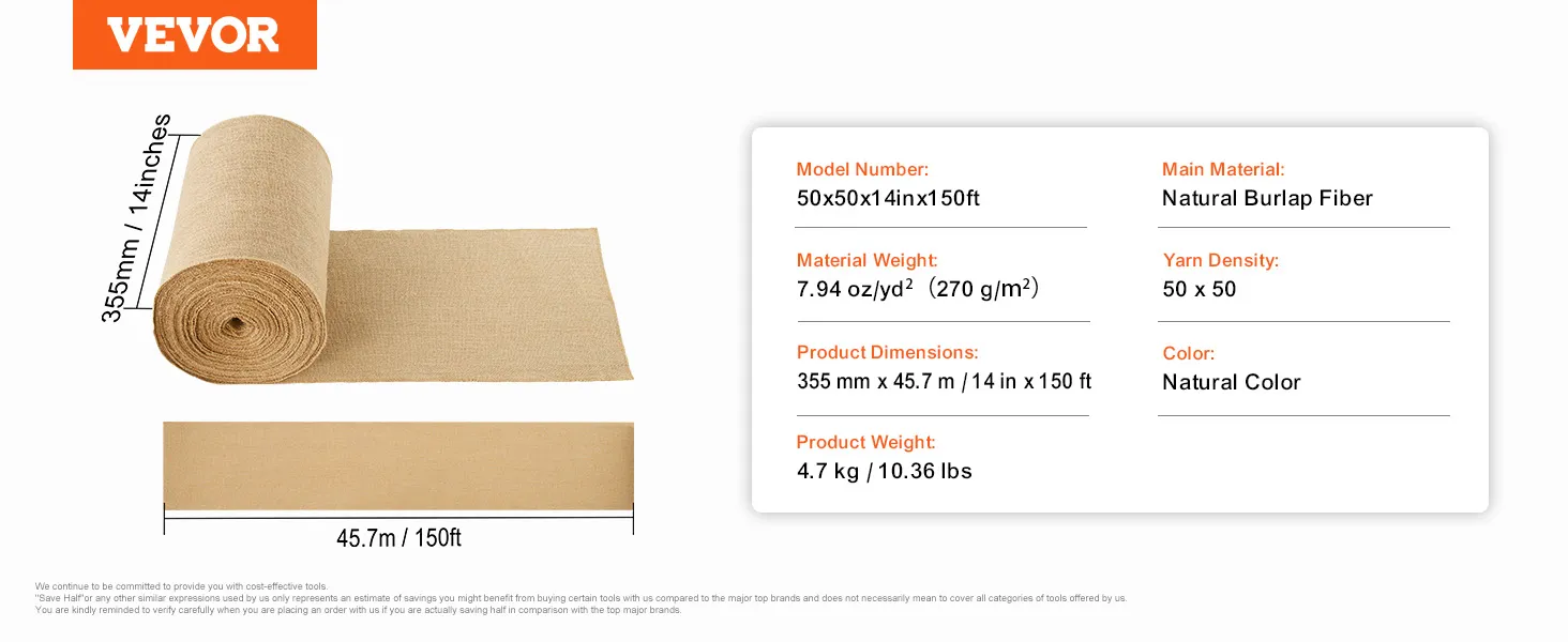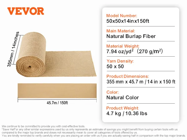VEVOR Burlap Fabric Roll, 14” x 150 ft & 50 x 50 High Density Wide Natural Burlap Fabric Rolls, Jute Fabric Burlap Tree Wrap Roll, for Decor, Crafts, Wedding, Gardening, Plant & Tree Winter Covering