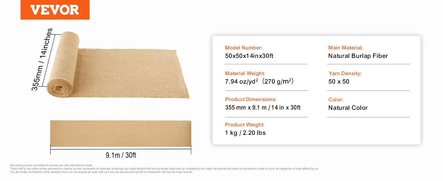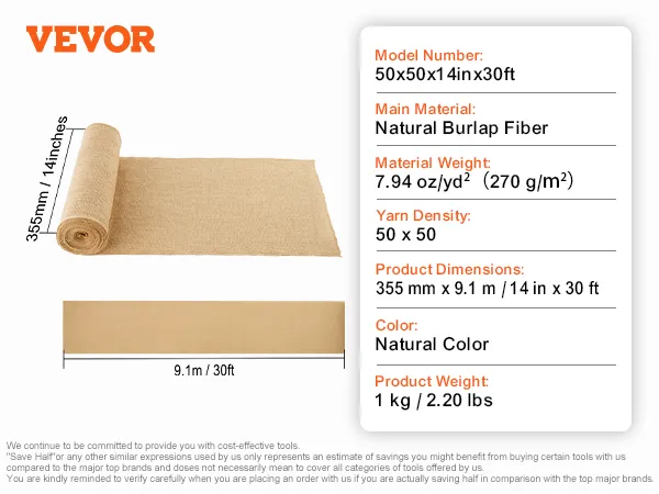 VEVOR Burlap Fabric Roll, 14” x 30 ft & 50 x 50 High Density Wide Natural Burlap Fabric Rolls, Jute Fabric Burlap Tree Wrap Roll, for Decor, Crafts, Wedding, Gardening, Plant & Tree Winter Covering