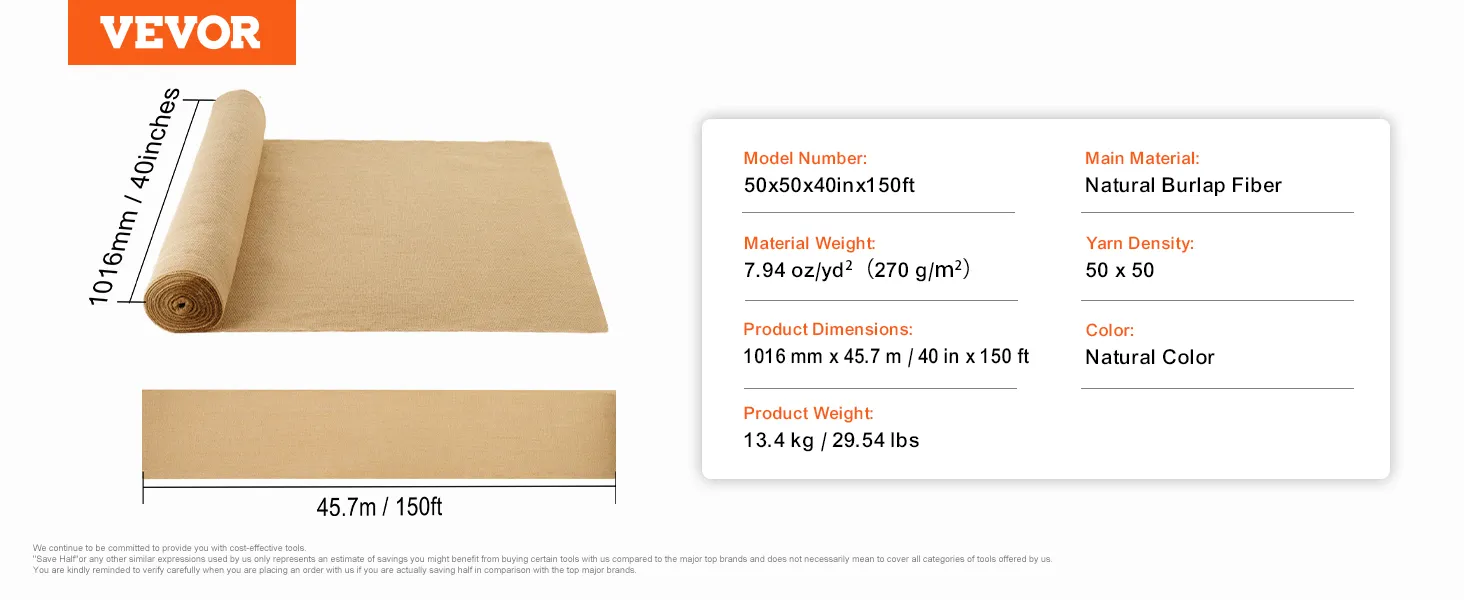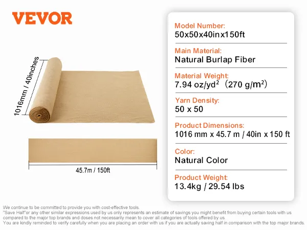 VEVOR Burlap Fabric Roll, 40” x 150 ft & 50 x 50 High Density Wide Natural Burlap Fabric Rolls, Jute Fabric Burlap Tree Wrap Roll, for Decor, Crafts, Wedding, Gardening, Plant & Tree Winter Covering