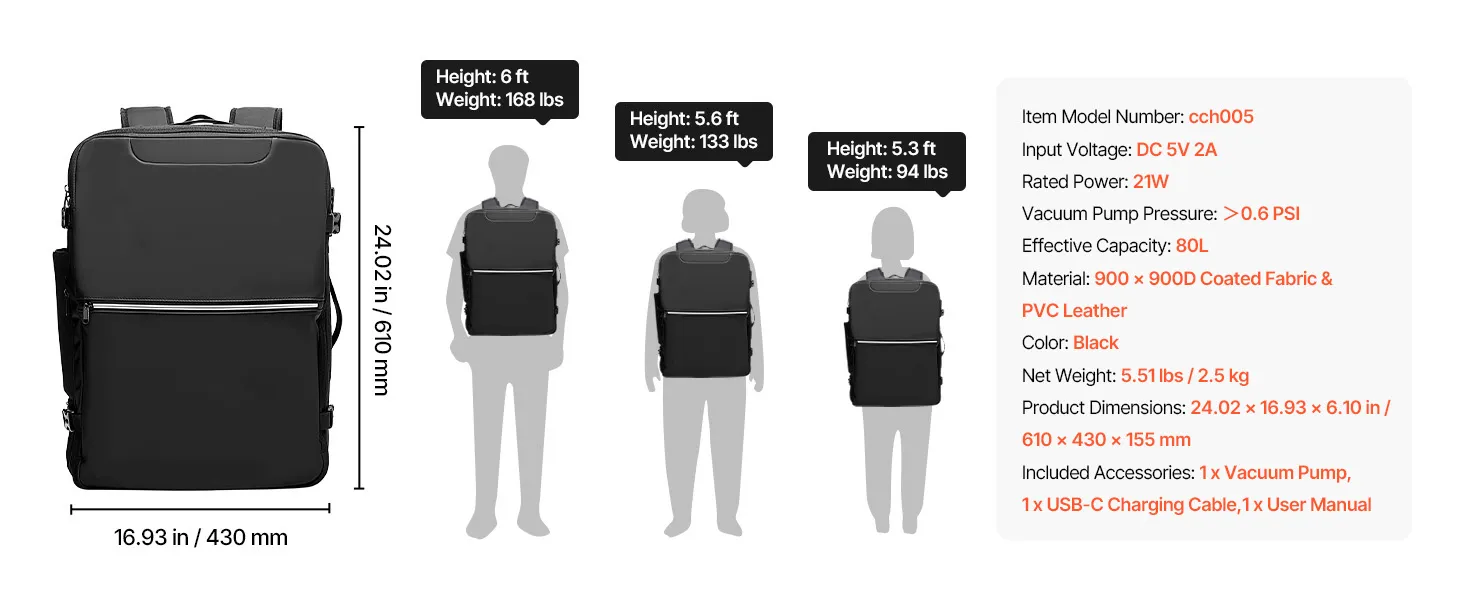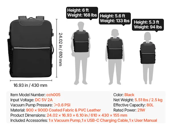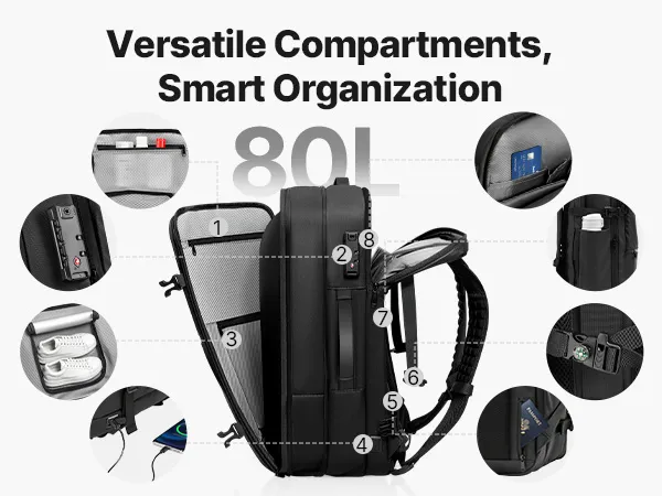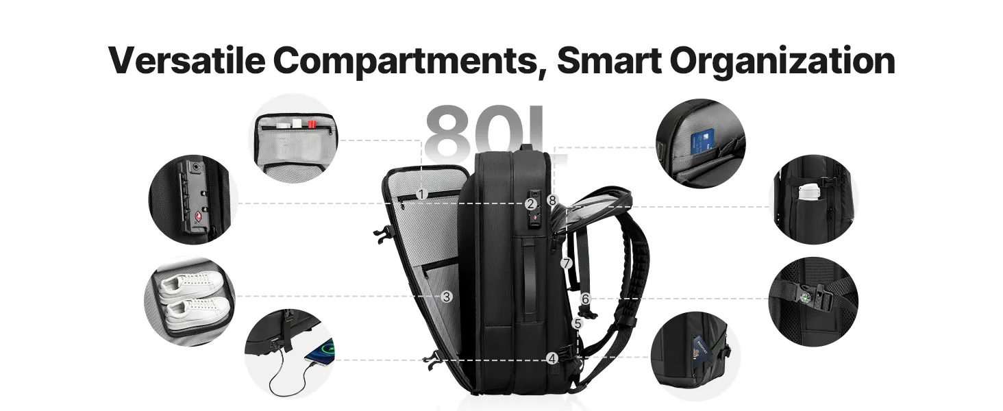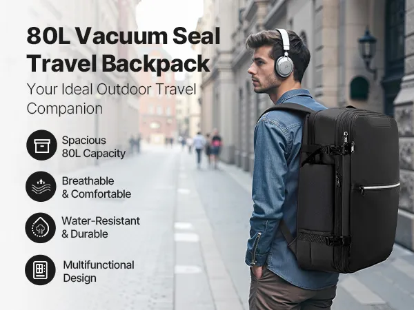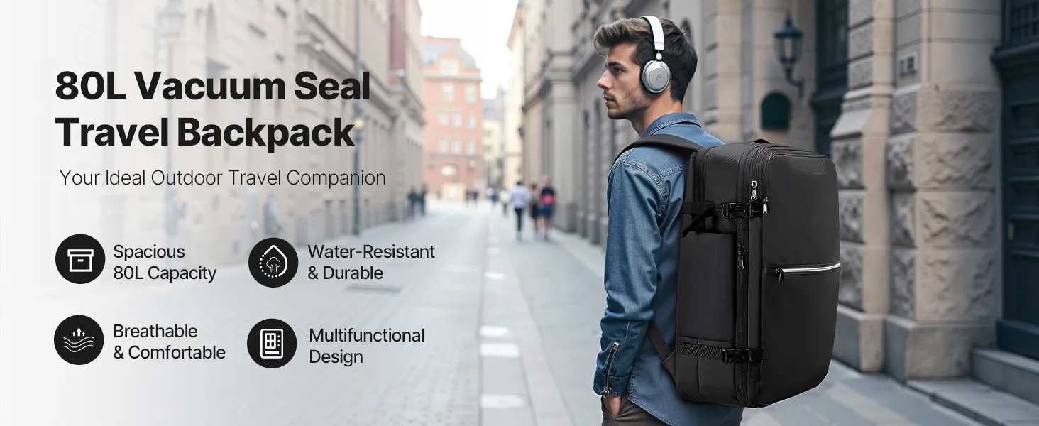 Moeiteloze vacuümcompressie: Uitgerust met een mini-vacuümpomp en een 4,5 cm brede expansielaag comprimeert deze vacuümreisrugzak moeiteloos volumineuze kleding. De inhoud is vergroot tot wel 80 liter – ideaal voor lange wandelingen, internationale reizen of uitgebreide zakenreizen.