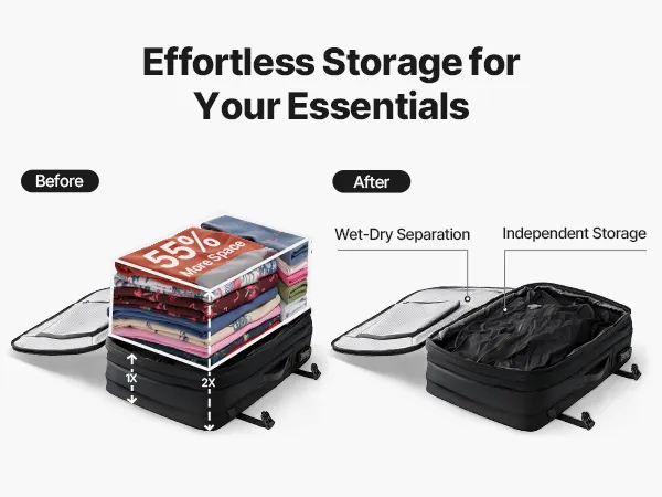 Meerdere compartimenten en zakken: Voorzien van doordacht ontworpen compartimenten, inclusief een scheidingswand voor natte en droge spullen, een kaartenvak, een antidiefstalvak, etc. Alles heeft zijn eigen plekje in onze vacuümverzegelde reistas.