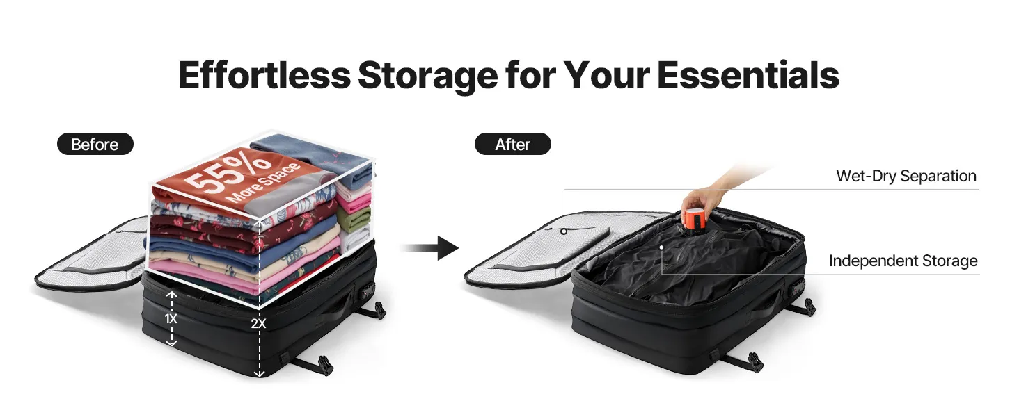 Met een mini-vacuümpomp voor moeiteloze compressie. Uitgerust met speciale compartimenten en multifunctionele vakken, zoals een scheidingswand voor droge en natte spullen, een geïsoleerd vak en een antidiefstalvak, biedt deze rugzak voldoende ruimte voor je kleding en dagelijkse benodigdheden. Een TSA-goedgekeurd slot zorgt voor extra veiligheid.