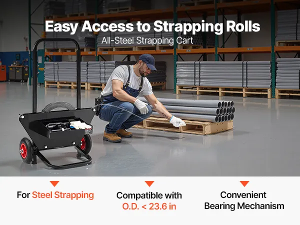 Fits Multiple Strap Sizes: This all-steel strapping cart holds up to 110 lbs and fits under 23.6 in core steel rolls. Keep your straps neat and ready, increasing efficiency for heavy-duty work