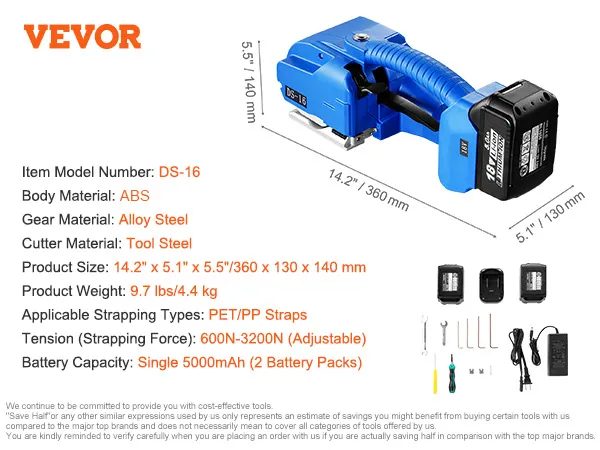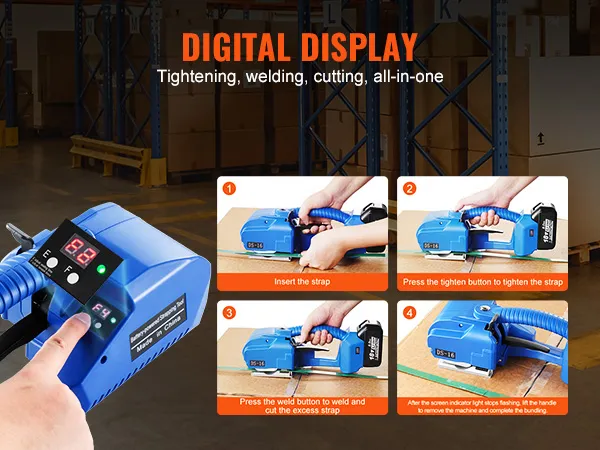 VEVOR elektrische omsnoeringsmachine, voor 0,35"-0,63" PP-PET-banden, draagbare elektrische omsnoeringsmachine met digitaal display, 2 x 5000 mAh op batterijen werkend automatisch omsnoeringsapparaat voor het verpakken van kartonnen pallets