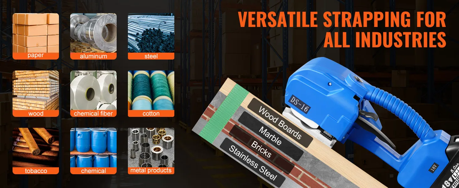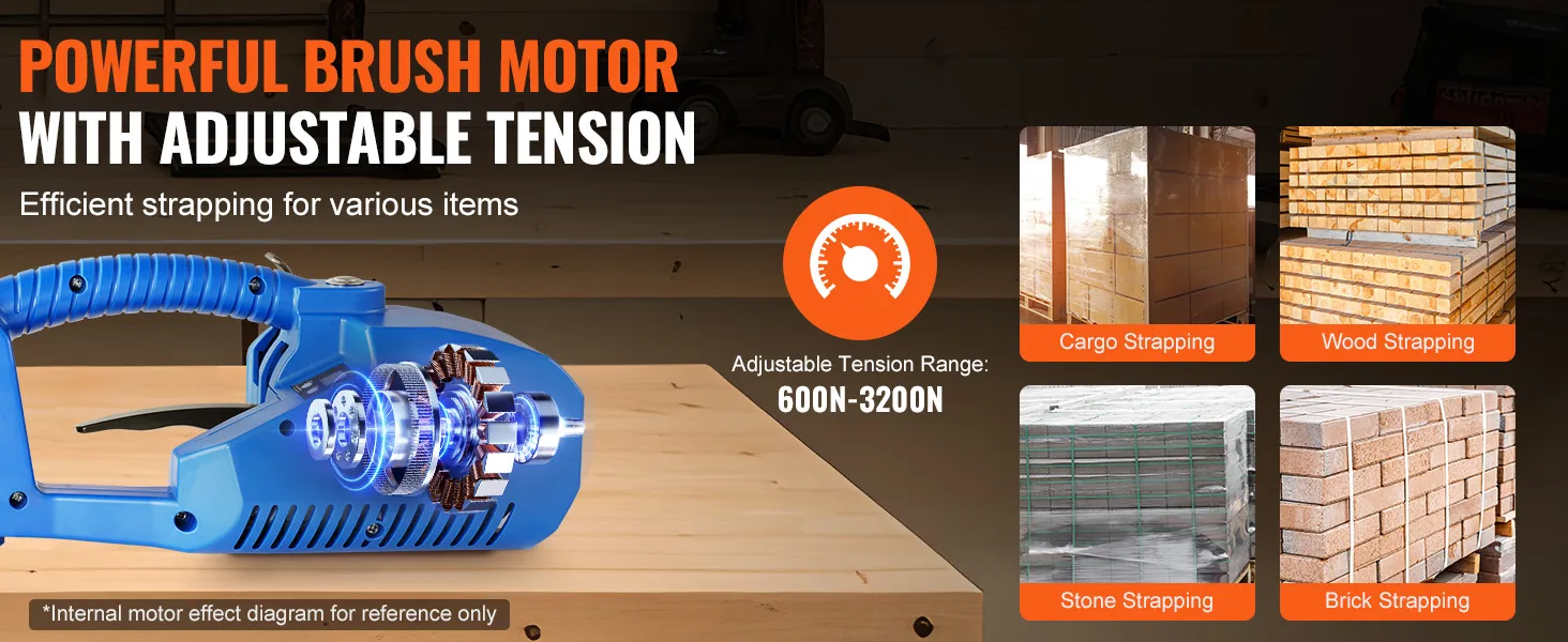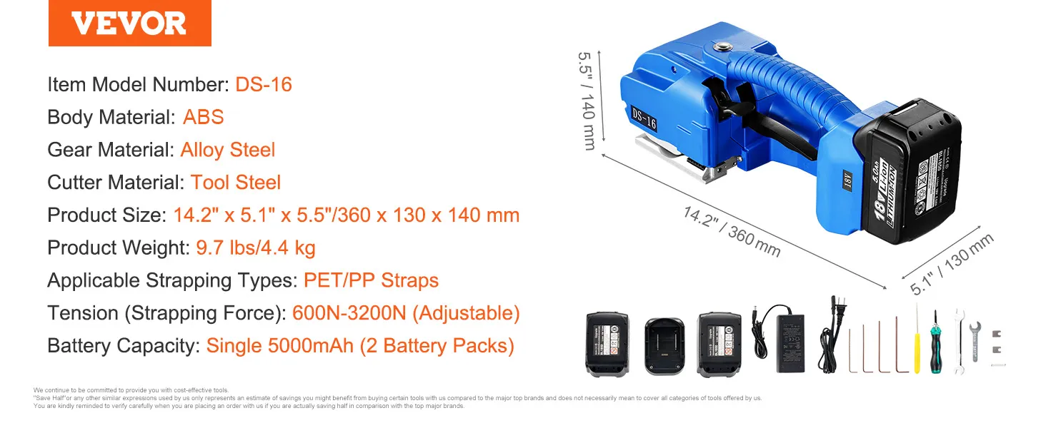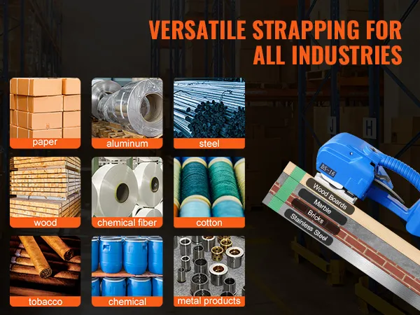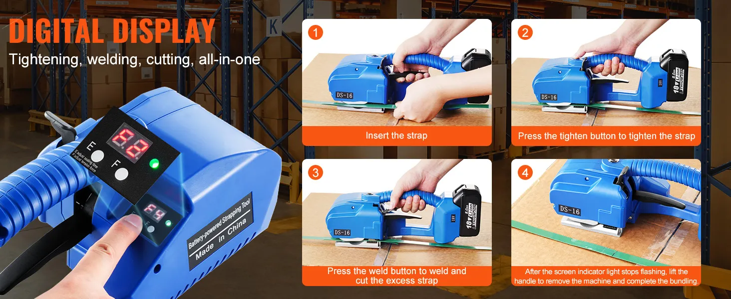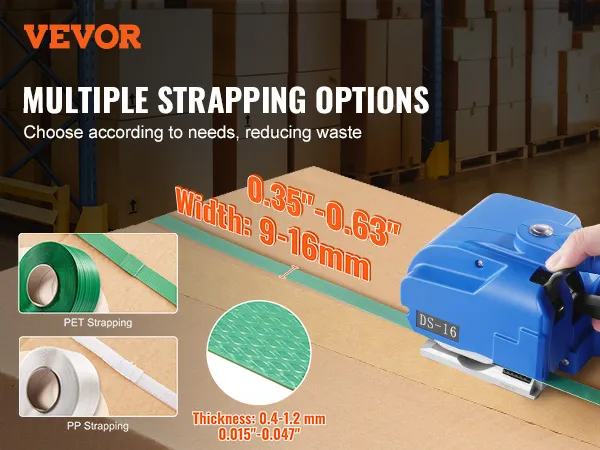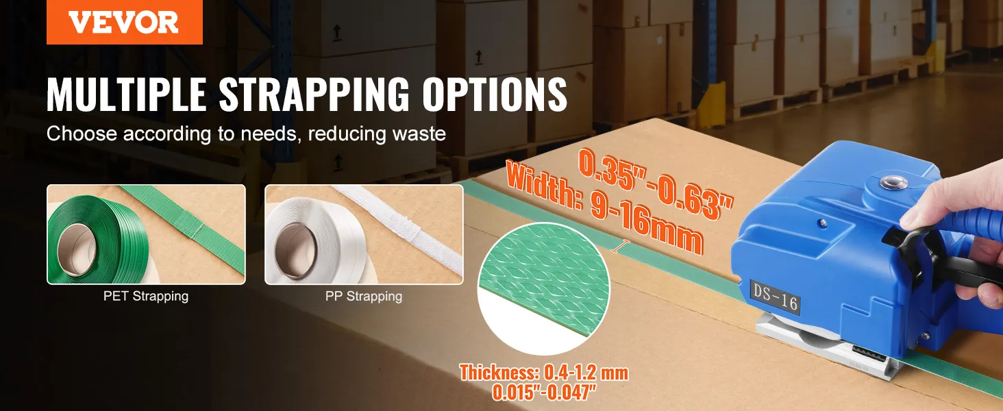 Veelzijdige omsnoeringsmogelijkheden: Onze elektrische omsnoeringsmachine werkt uitstekend met omsnoeringsband van polypropyleen (PP) en polyester (PET). Het kan breedtes aan van 0,35 tot 0,63 inch (0,89 tot 1,6 cm) en diktes van 0,02 tot 0,05 inch (0,05 tot 0,127 cm). Dit betekent dat u eenvoudig artikelen van verschillende afmetingen en gewichten kunt verpakken en kosten kunt besparen door de juiste tape voor de klus te kiezen.