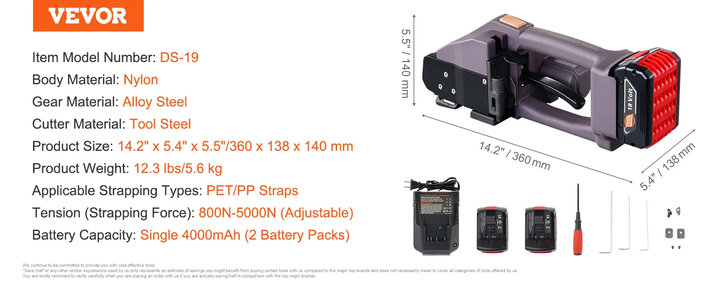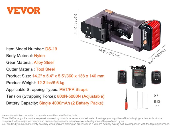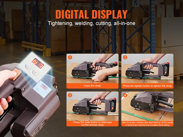 VEVOR elektrische omsnoeringsmachine, voor 0,39"-0,75" PP-PET-banden, draagbare elektrische omsnoeringsmachine met digitaal display, 2 x 4000 mAh op batterijen werkend automatisch omsnoeringsapparaat voor het verpakken van kartonnen pallets