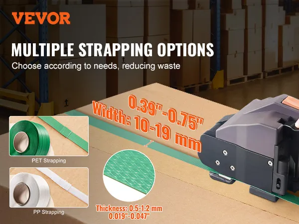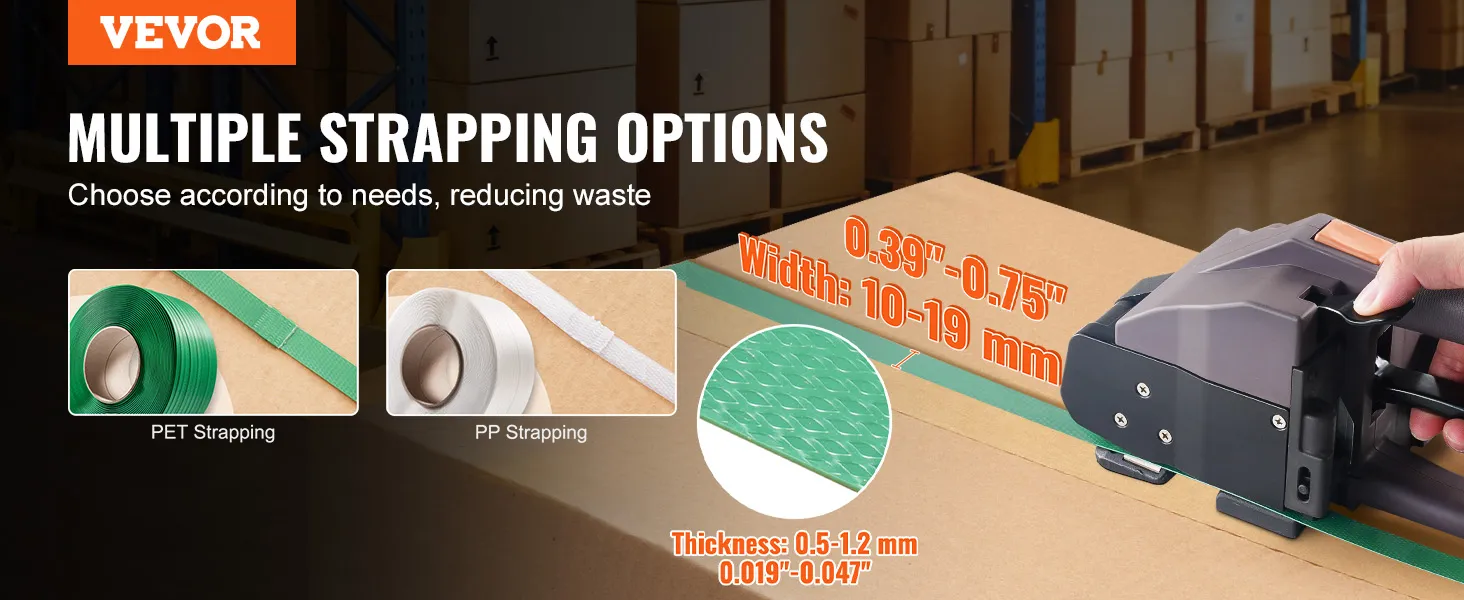 Veelzijdige omsnoeringsmogelijkheden: Onze elektrische omsnoeringsmachine werkt uitstekend met omsnoeringsband van polypropyleen (PP) en polyester (PET). Het kan breedtes aan van 0,39 tot 0,75 inch (1 tot 2 cm) en diktes van 0,02 tot 0,05 inch (0,05 tot 0,127 cm). Dit betekent dat u eenvoudig artikelen van verschillende afmetingen en gewichten kunt verpakken en kosten kunt besparen door de juiste tape voor de klus te kiezen.
