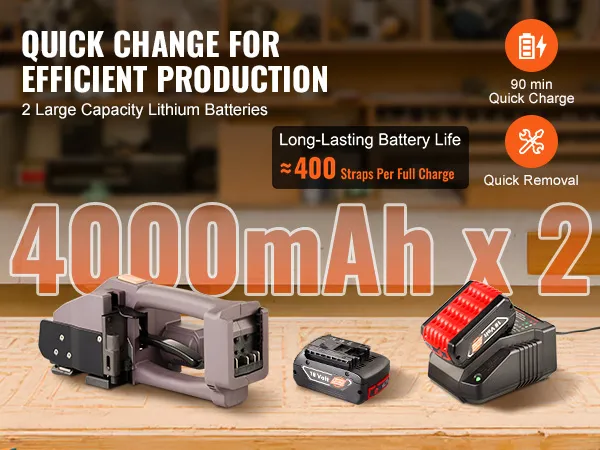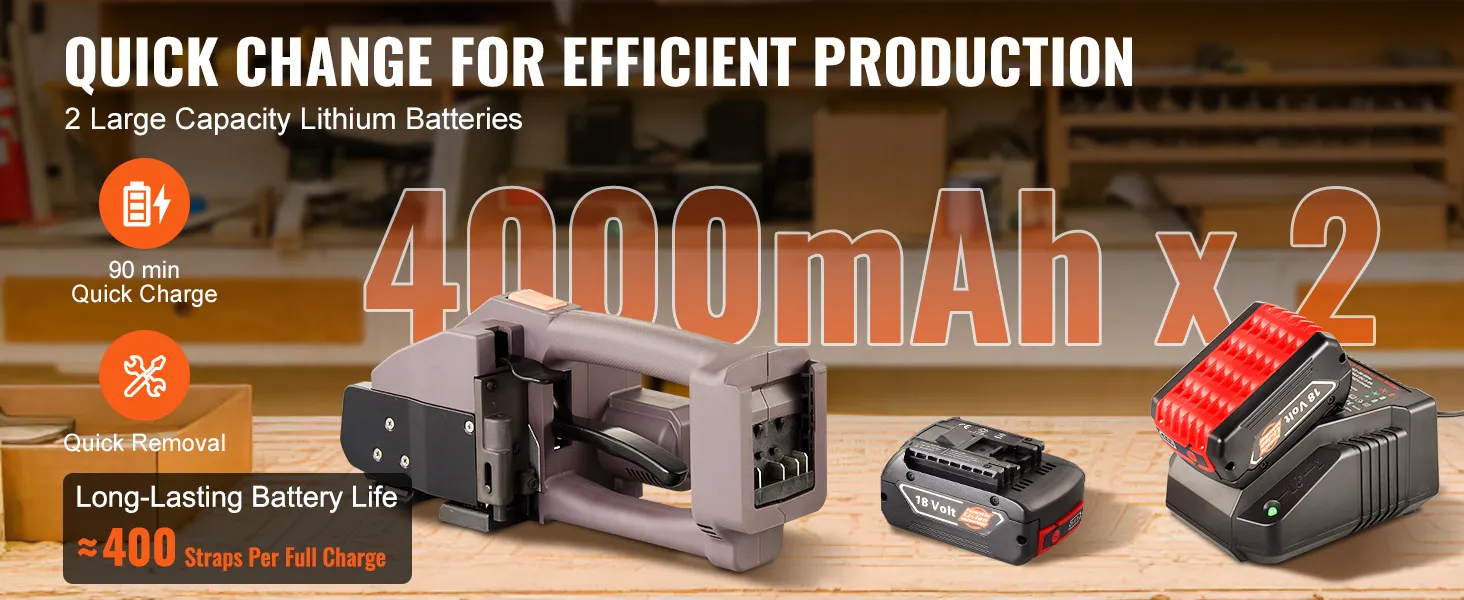 De elektrische omsnoeringsmachine wordt geleverd met 2 uitneembare accupacks. Laad hem in slechts 90 minuten op en je kunt zonder onderbrekingen verder werken. De ene batterij kan worden gebruikt terwijl de andere wordt opgeladen. Hierdoor blijft u in beweging en verhoogt u uw efficiëntie.