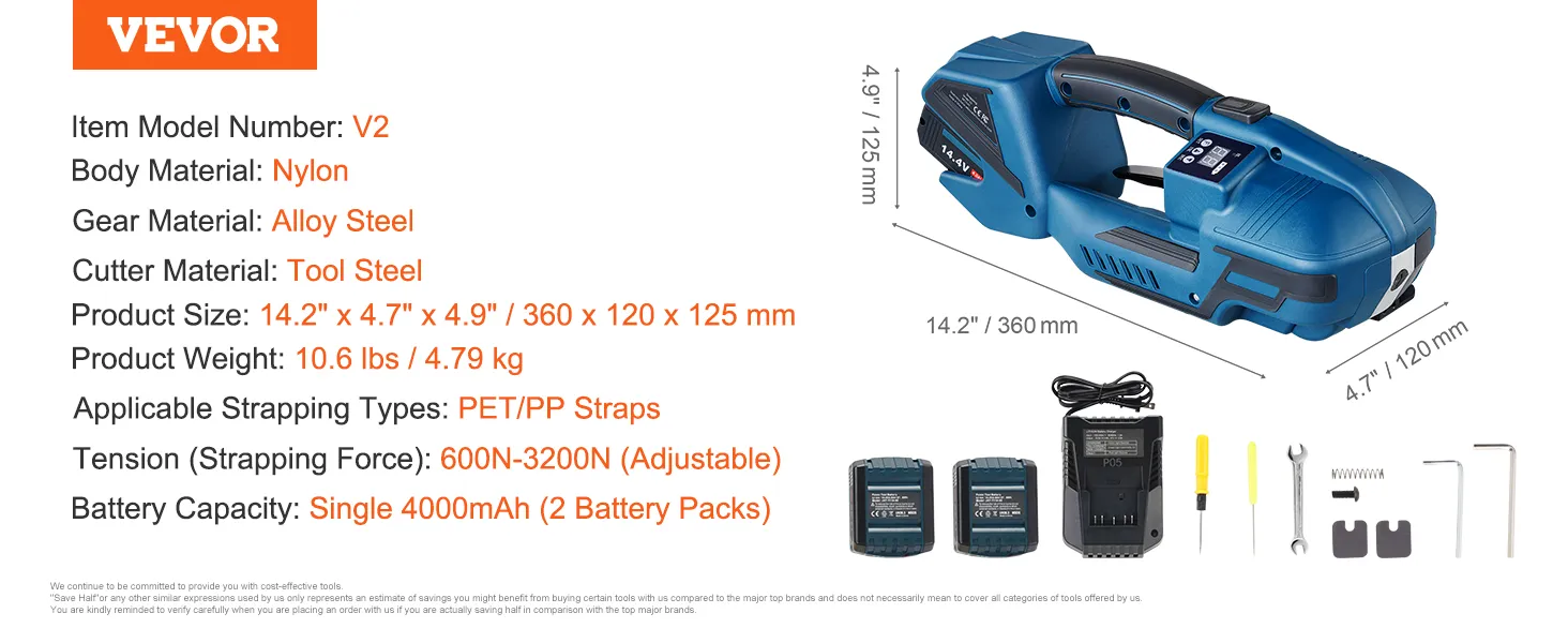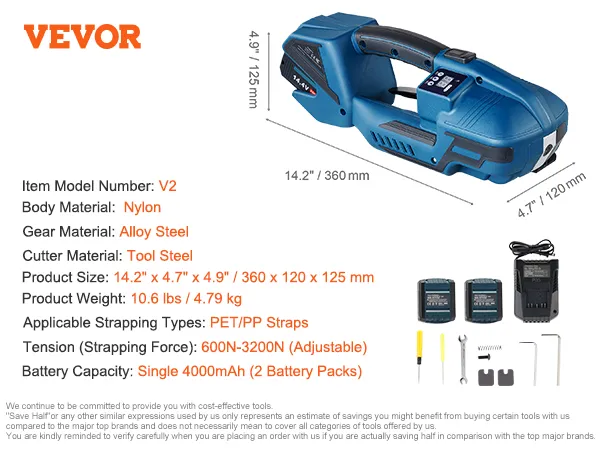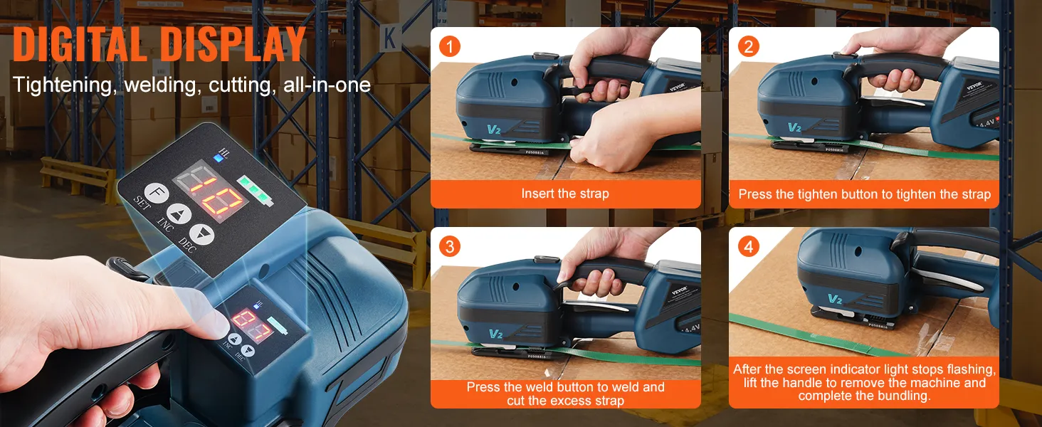 VEVOR Electric Strapping Machine, for 0.35"-0.63" PP PET Straps, Portable Electric Banding Tool with Digital Display, 2 x 4000mAh Battery Powered Automatic Strapping Tool for Packaging Box Pallet