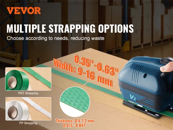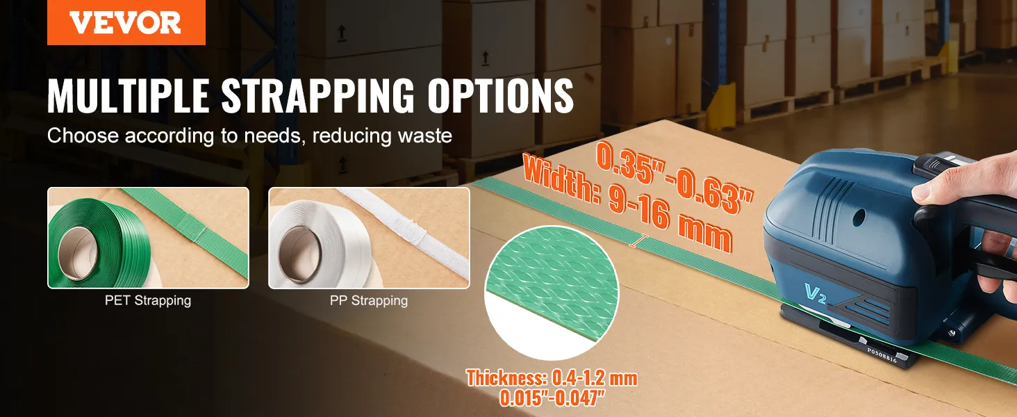 Versatile Strapping Options: Our electric strapping machine works great with polypropylene (PP) and polyester (PET) strapping bands. It handles widths from 0.35" to 0.63" and thicknesses from 0.02" to 0.05". This means you can easily pack items of different sizes and weights, saving you cost by choosing the right strap for the job.
