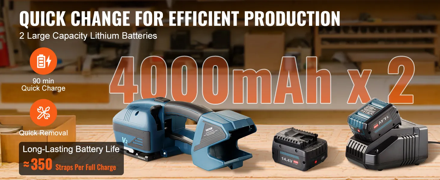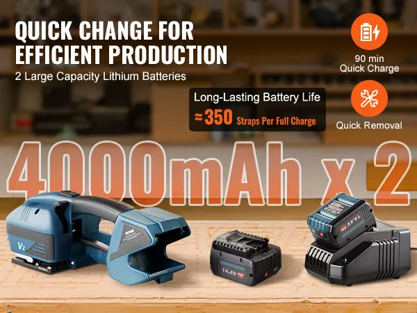 Large Battery for Efficient Production: Powered by two 4000mAh lithium batteries, this electric banding tool lets you strap up to 350 times on a full charge. It charges quickly in just 90 minutes and has a detachable design, so you can swap batteries on the go. Less downtime means more productivity and less hassle for you.