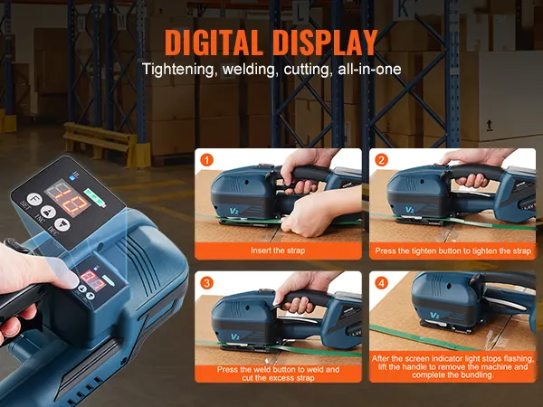 Adjusting the tension and welding time is super simple with our strapping machine's digital display. You've got multiple settings to choose from, making your job easier and faster. Tightening, welding, and cutting are all in one device, so you can get going quickly.
