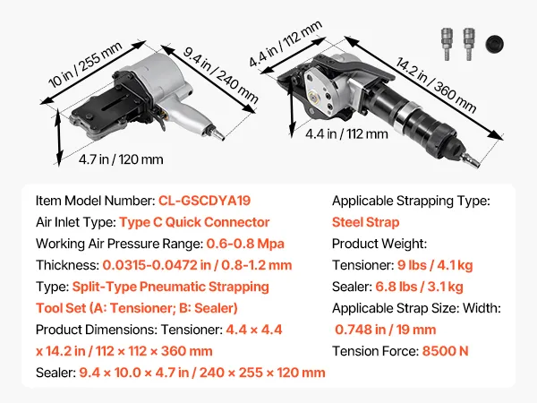 VEVOR pneumatische omsnoeringsmachine, 8500N spankracht, gereedschap voor het omsnoeren van metaal, spanner en snijder/sealer voor 19 mm brede metaalbanden, splitbalenpers voor verpakking