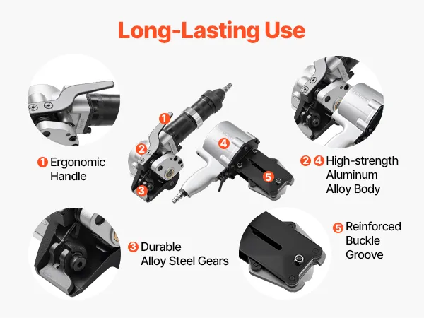 Gebruiksvriendelijk: Rijg de band eenvoudig door, span hem aan met de spanner en sluit hem met de sluiting. Zelfs beginners kunnen onze pneumatische staalbandtang gemakkelijk bedienen. De aluminium behuizing en stalen tandwielen garanderen duurzaamheid en betrouwbaarheid.