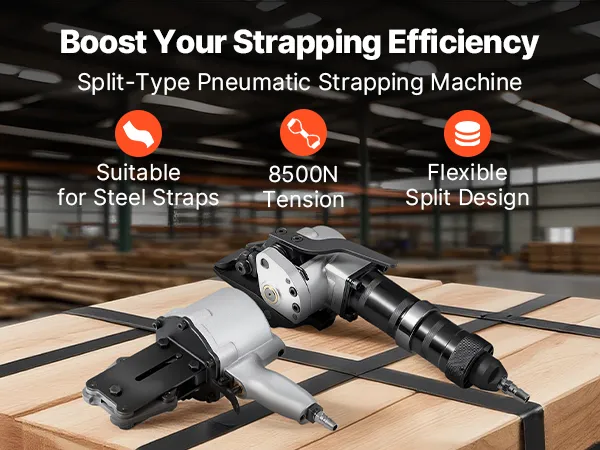 Heavy-duty Strapping: This pneumatic strapping machine delivers 8500N tension, making it easy to secure pallets, stone, steel, and coils. It saves effort, saves time, and boosts efficiency for tough jobs