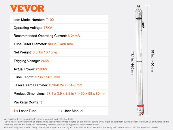 VEVOR 100W CO2-laserbuis, 57" (1450 mm) lengte