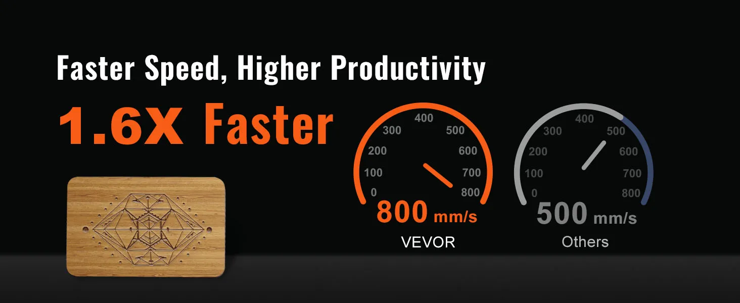Q: What are the speeds for engraving and cutting? A: Engraving Speed: 0-800 mm/s; Cutting Speed: 0-500 mm/s.