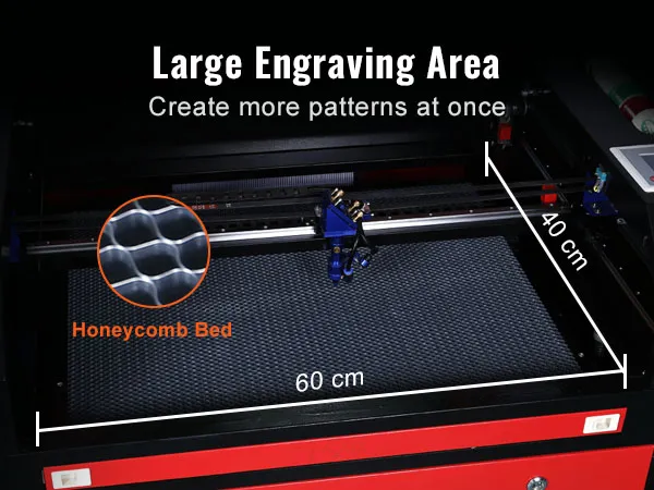 16 x 24 in Working Area: Is space a concern for you? Well, get ready to work comfortably! This CO₂ laser engraver features a spacious 16 x 24 in/400 x 600 mm working area, providing a generous 384 in² of workspace to fit all your projects. The bed is designed with a honeycomb structure to ensure high structural stability. Its front and back pass-through doors open up even greater possibilities.