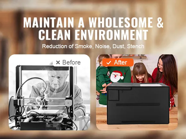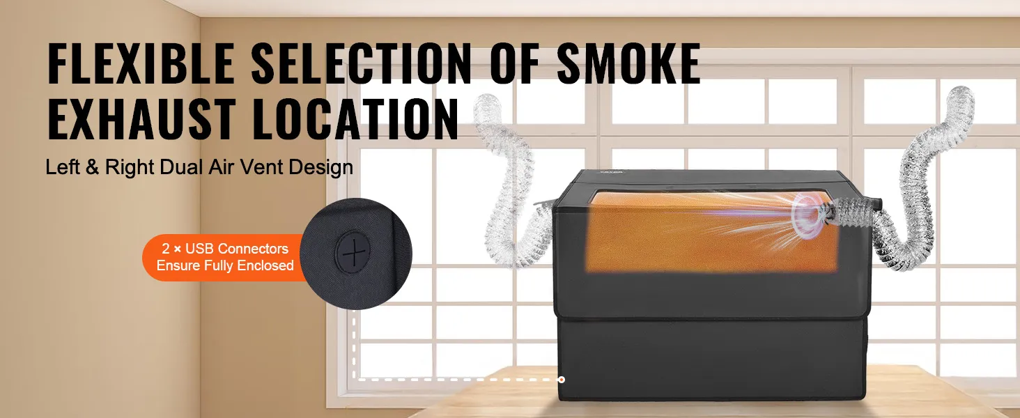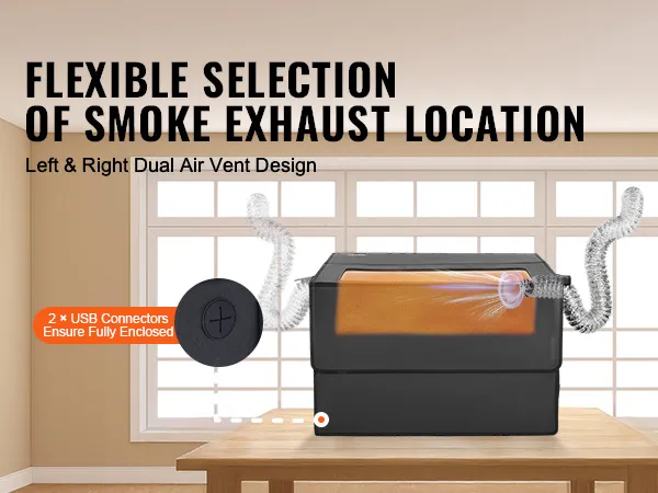 Isoleer rook en stank: het volledig gesloten ontwerp zorgt ervoor dat er geen rook ontsnapt. Een snelle ventilator van 4000 tpm elimineert op efficiënte wijze rook, lawaai, stof en stank, waardoor de luchtkwaliteit binnenshuis aanzienlijk wordt verbeterd. Uitlaatopeningen aan beide zijden zorgen voor een flexibele plaatsing. Bied u een comfortabelere graveerervaring.