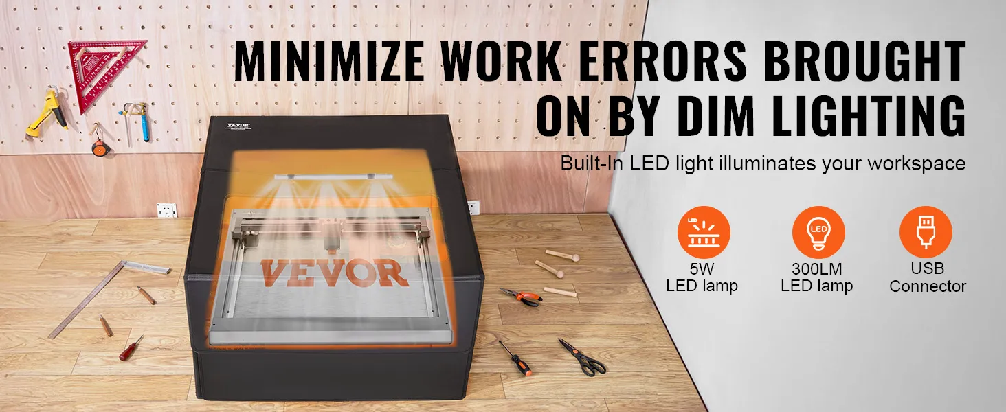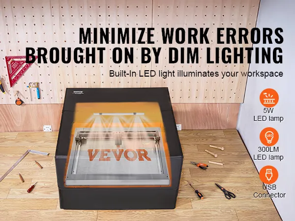De behuizing van de lasergraveerder is uitgerust met een 5W, 300lm LED-licht, waardoor fouten veroorzaakt door onvoldoende verlichting aanzienlijk worden verminderd. Dit zorgt voor een helder zicht tijdens het gebruik. Het USB-poortontwerp maakt het eenvoudig aan te sluiten en van stroom te voorzien.