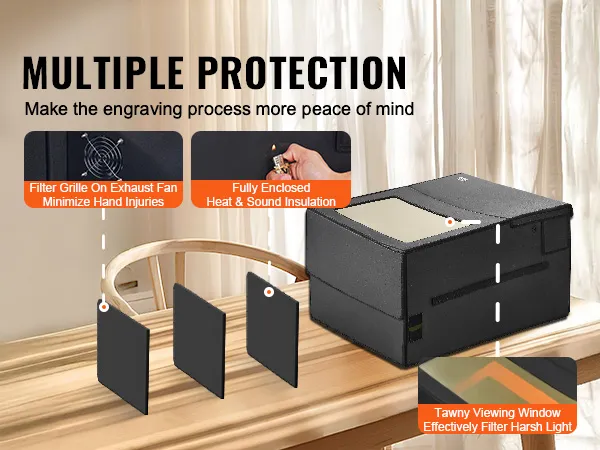 De volledig gesloten behuizing van de lasergraveerder isoleert effectief warmte, geluid en geur. Uitgerust met een afzuigventilator met filterrooster om handletsel te minimaliseren. Het geelbruine PVC-raamontwerp filtert blauw licht effectief, waardoor het werkcomfort toeneemt.