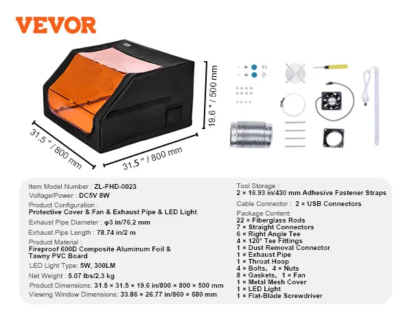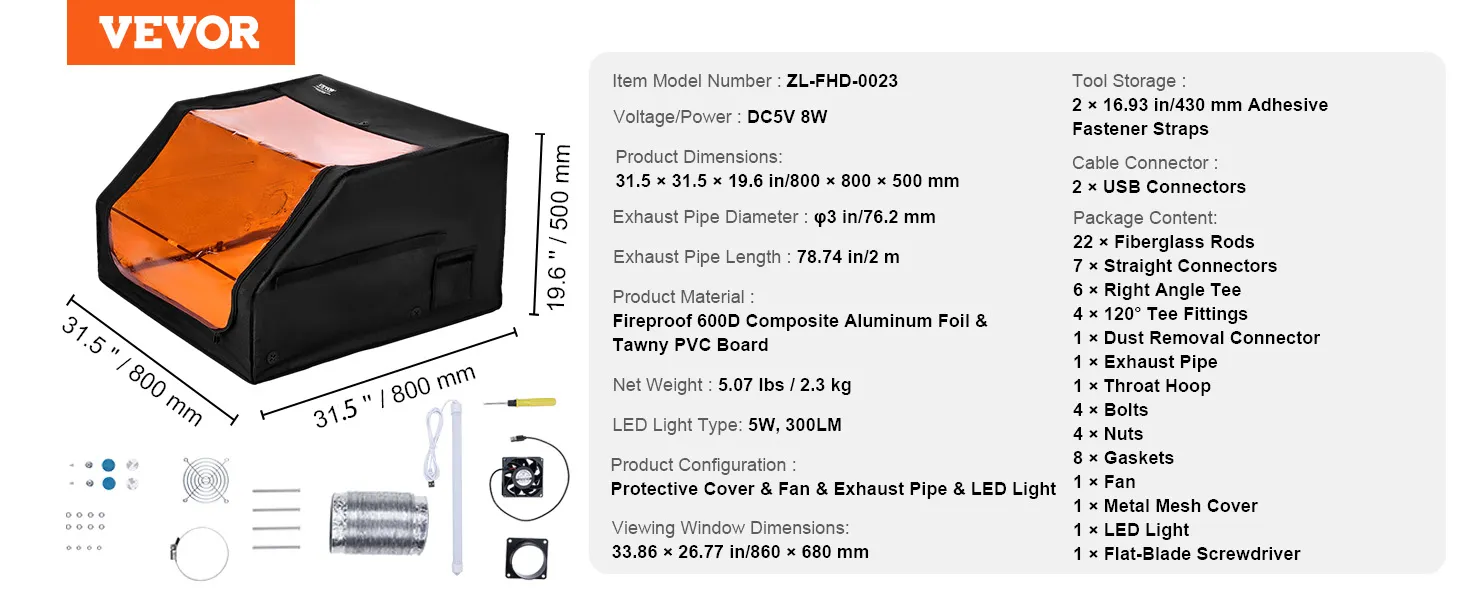 VEVOR Lasergraveermachinebehuizing, 800 x 800 x 500 mm, brandwerende beschermhoes, met afzuigventilator en pijp, isoleert rook en geluid en beschermt de ogen. Laserbehuizing past op de meeste lasergraveermachines.