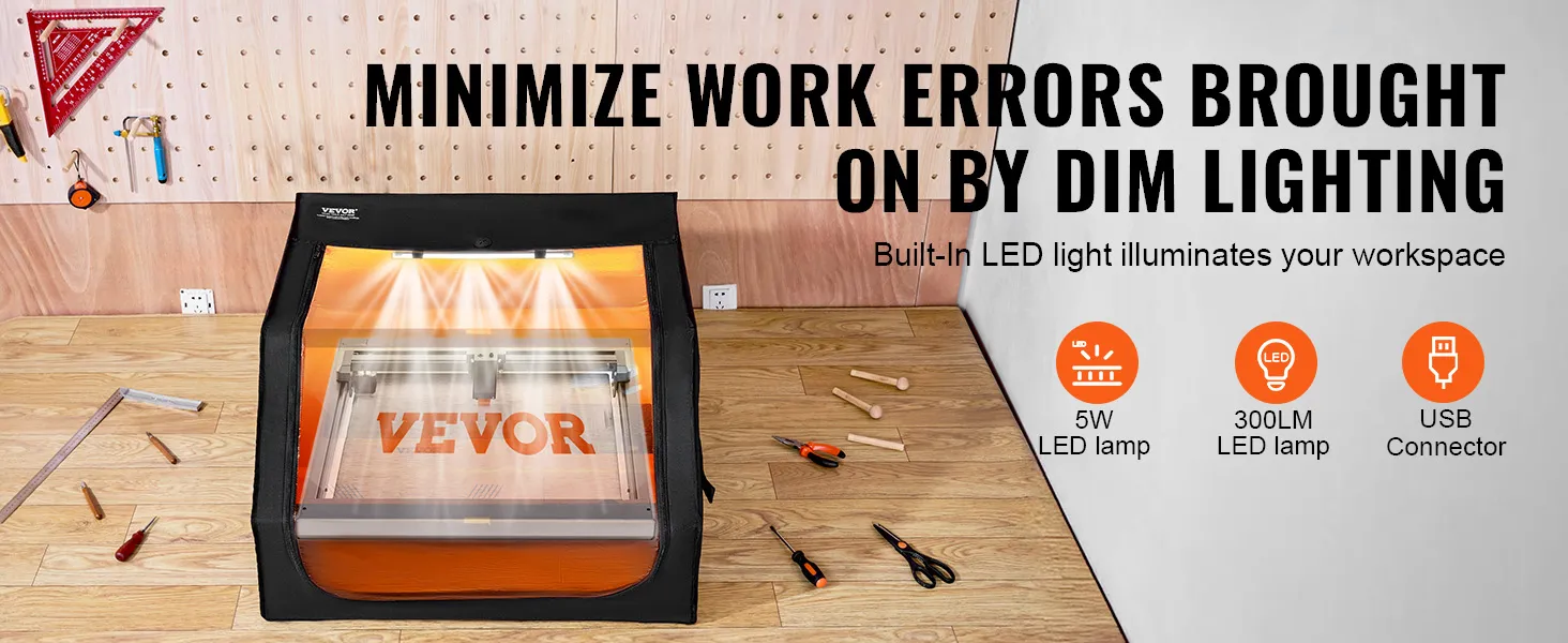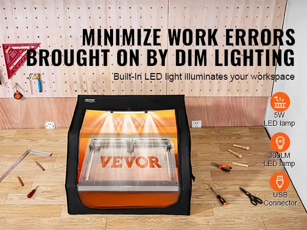 De behuizing van de lasergraveerder is uitgerust met een 5W, 300lm LED-licht, waardoor fouten veroorzaakt door onvoldoende verlichting aanzienlijk worden verminderd. Dit zorgt voor een helder zicht tijdens het gebruik. Het USB-poortontwerp maakt het eenvoudig aan te sluiten en van stroom te voorzien.